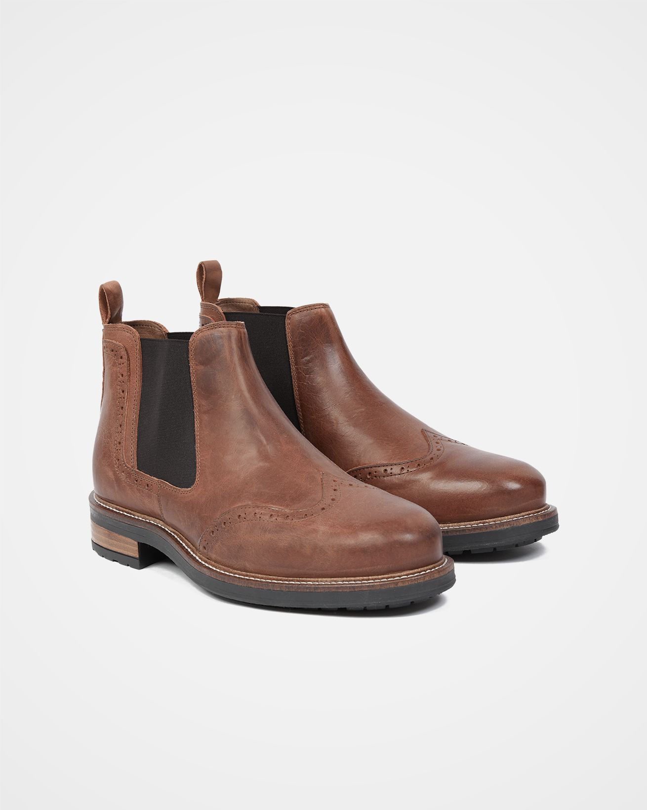 Combining two classic styles, we’ve designed a Chelsea boot with brogue detailing. This pull on boot features elasticated sides, pull on tabs at the heel, a robust cleated rubber sole with leather heel insert and added traditional brogue cutwork and seaming. Made from rich, rustic-look leather with a burnished finish, these boots will take you from day to night seamlessly.