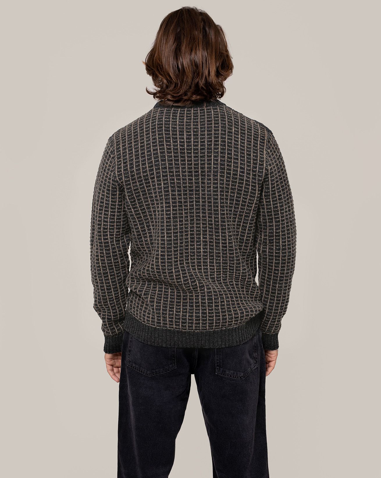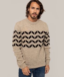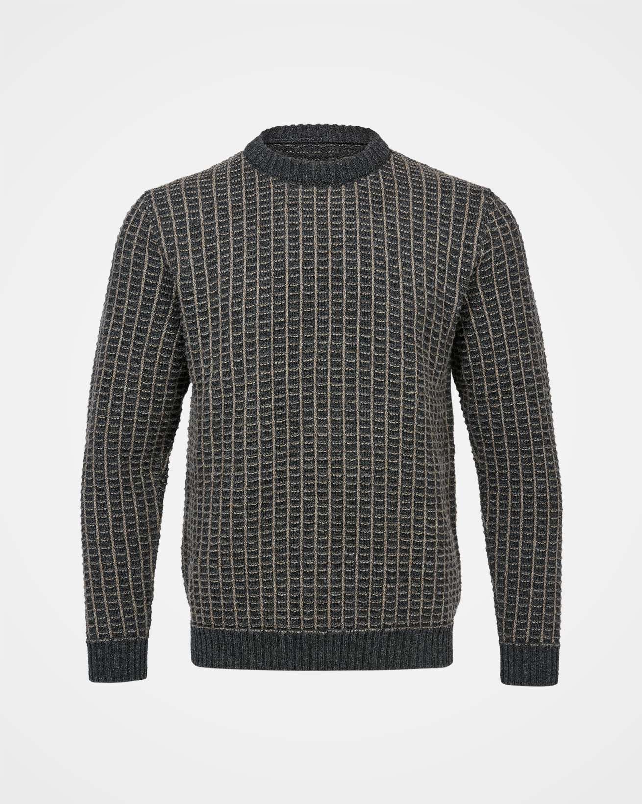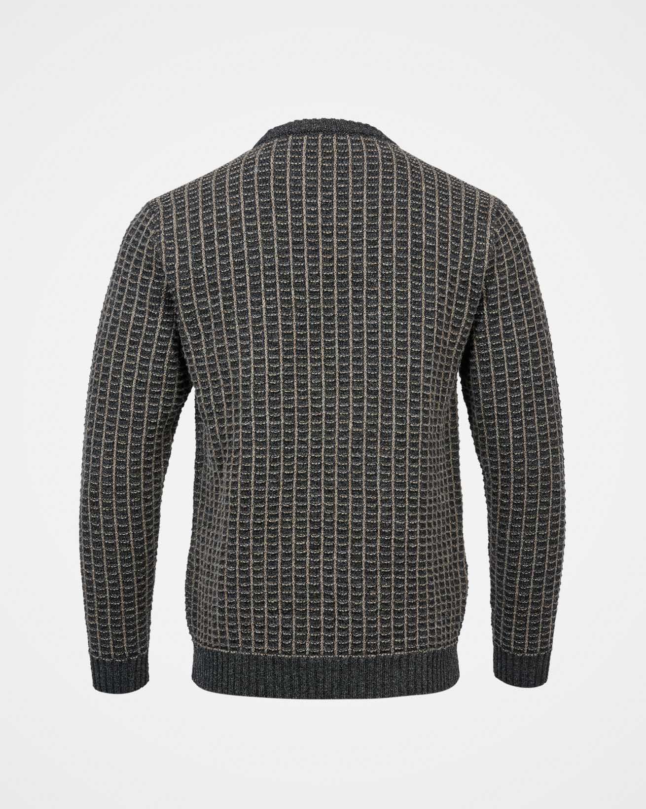 This 100% wool jumper features a crew neckline and a unique contrasting tuck and reverse stitch pattern. Ribbed cuffs, neckband, and hem ensure a comfortable fit, offering a distinctive look.