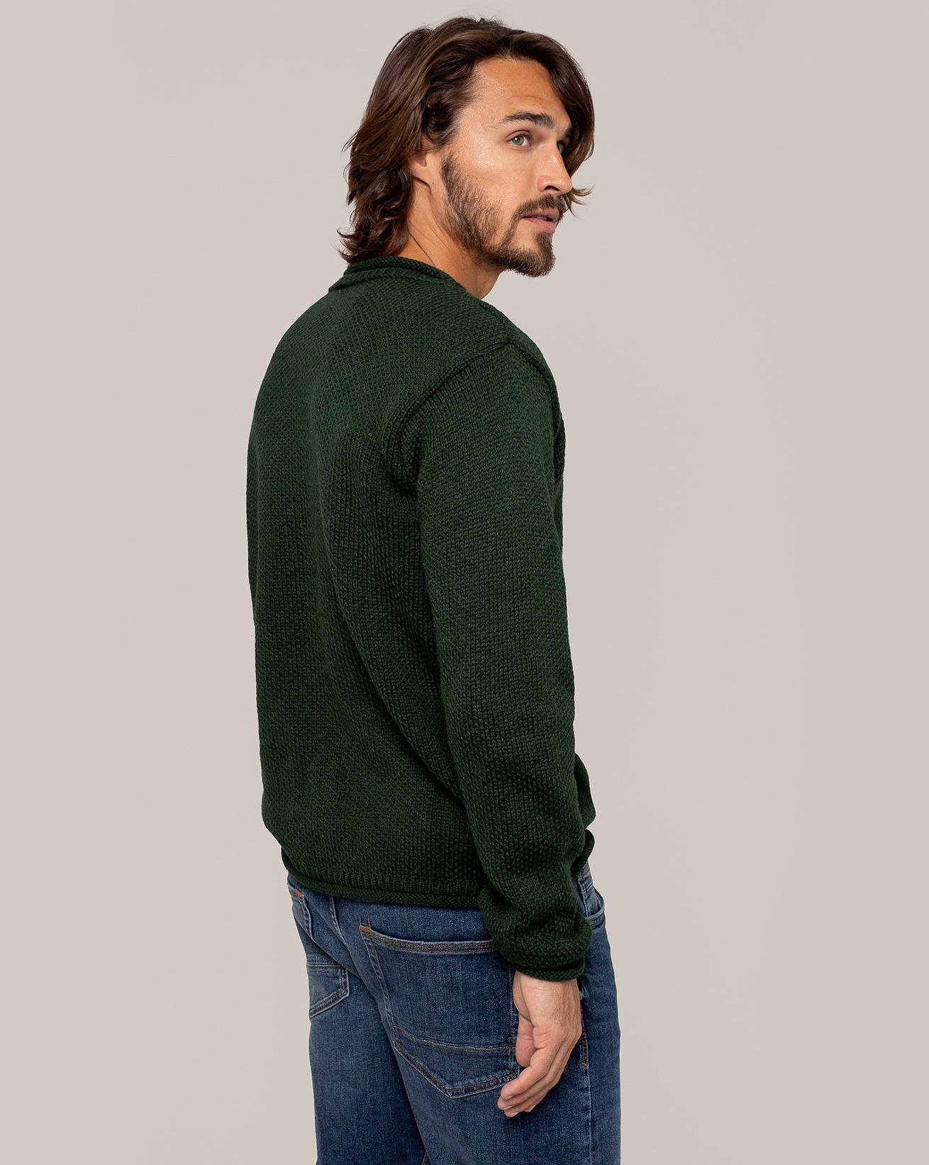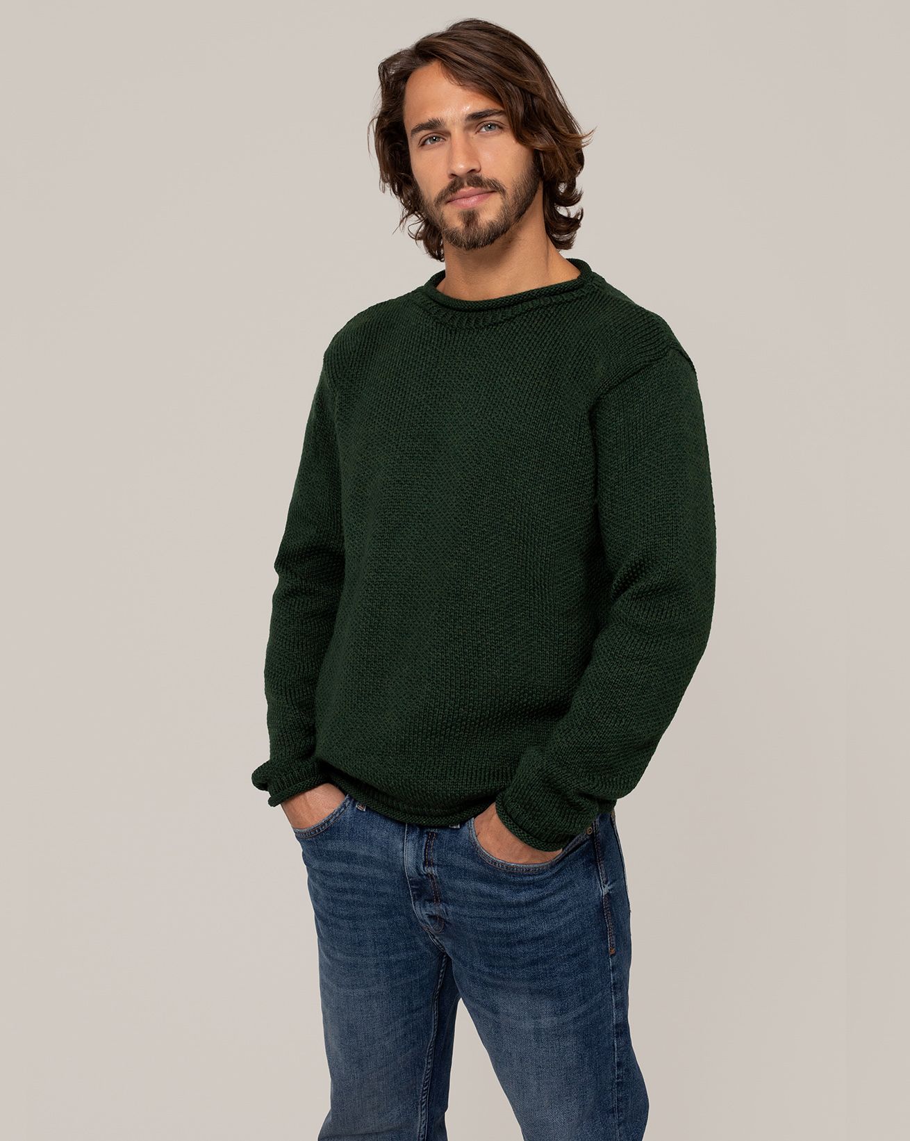 A classic knit made in Ireland to be worn on all occasions, from hikes in the hills to evening drinks. This crew neck jumper features a traditional rolled edge collar, cuffs and hem and is knitted in a textured moss stitch, a technique which makes the jumper subtly stand out from the rest.