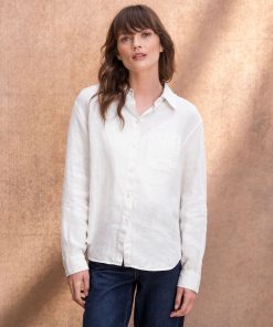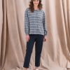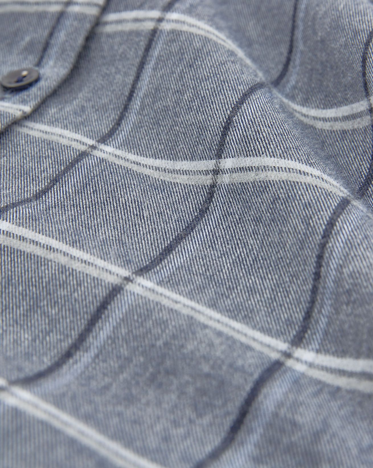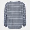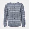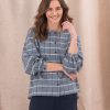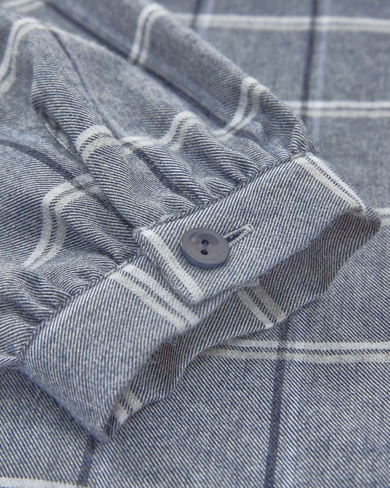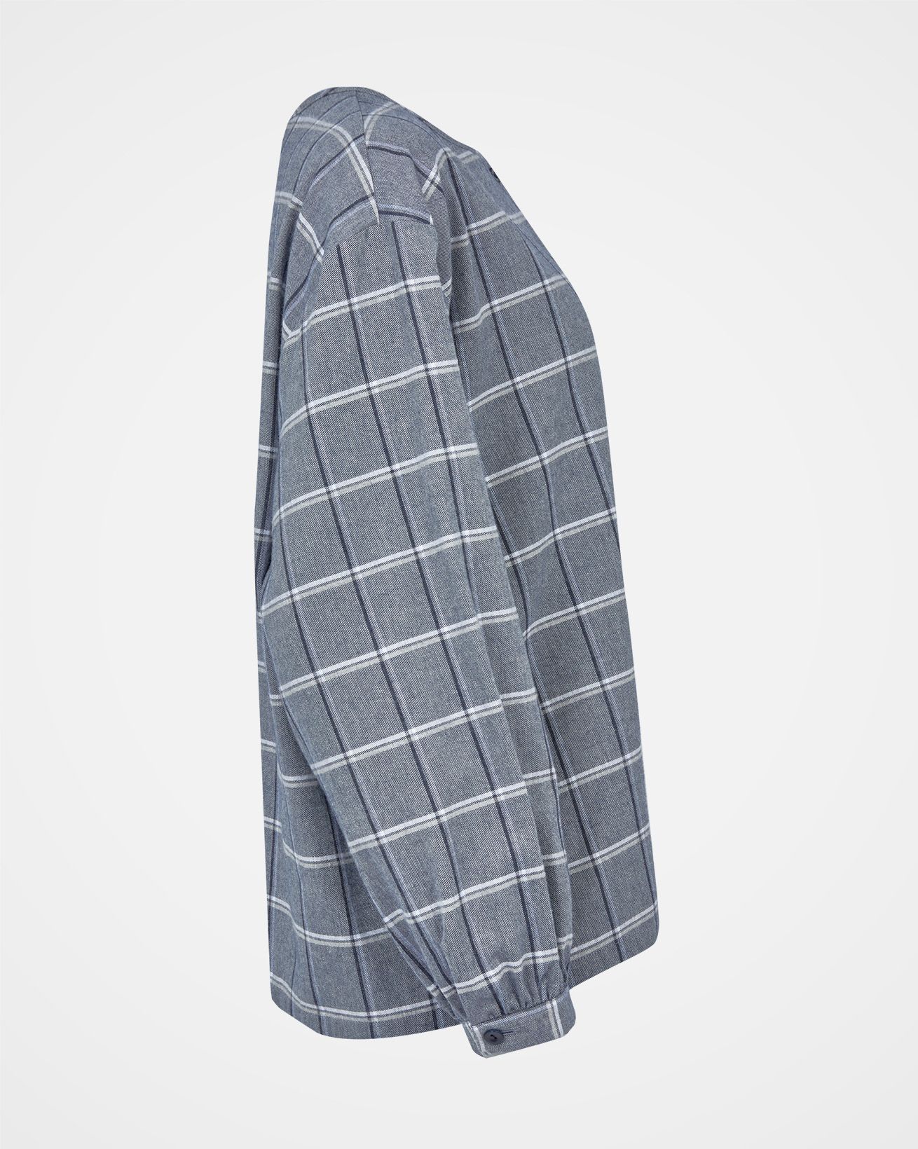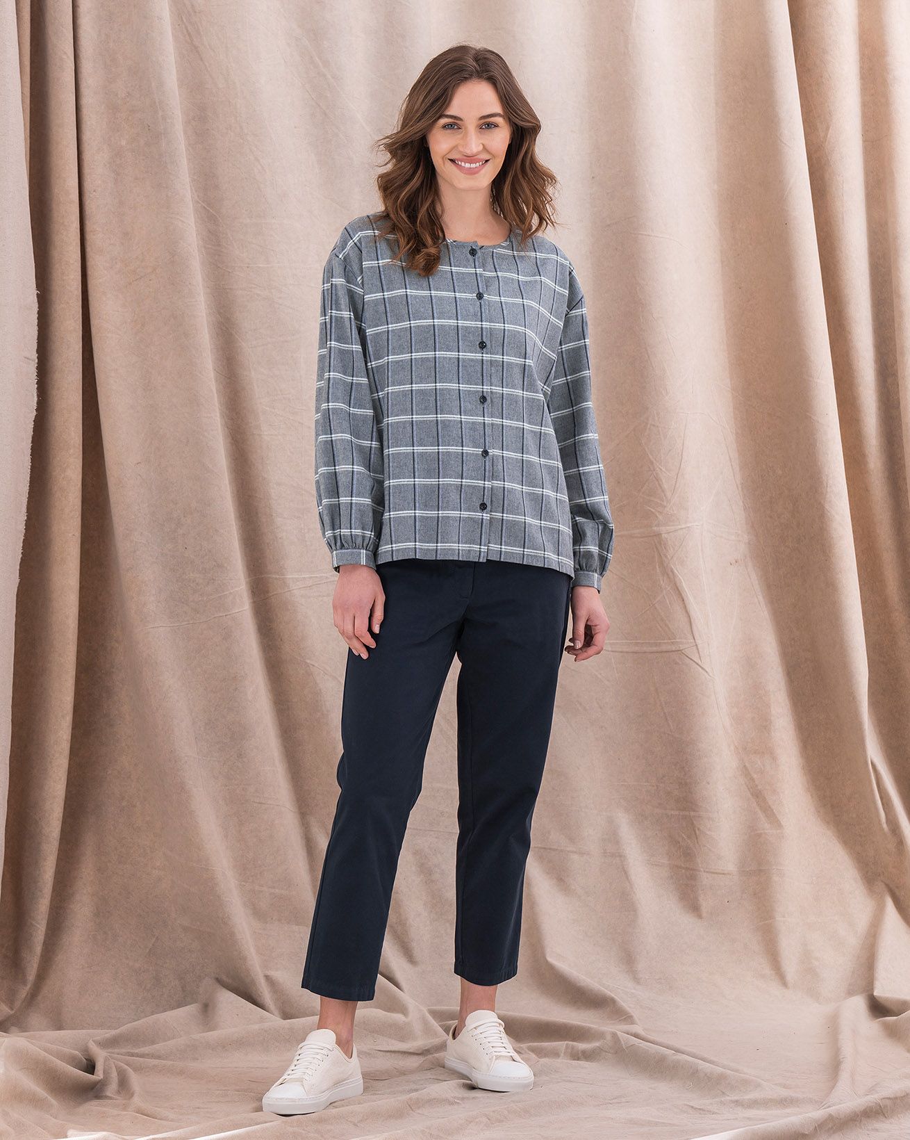 With a soft, flannel finish and in a light windowpane check fabric, this easy-to-wear shirt is collarless and has a pretty, wide crew neckline. Finished in a button-through style with natural Corozo buttons, it has a drop shoulder shape. The long sleeves have a soft fullness through gathering into the seam, and the cuffs are narrow and buttoned. Wear with denim and white trainers for casual comfort.