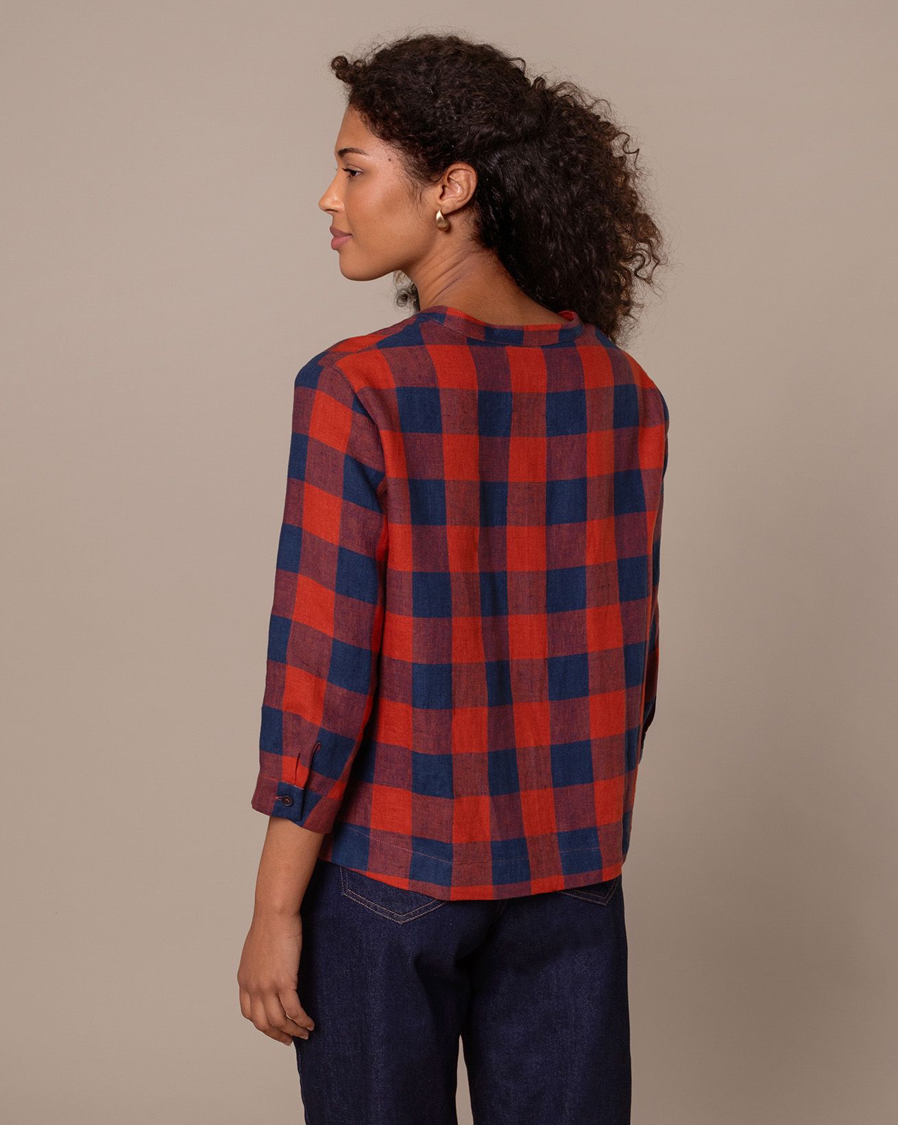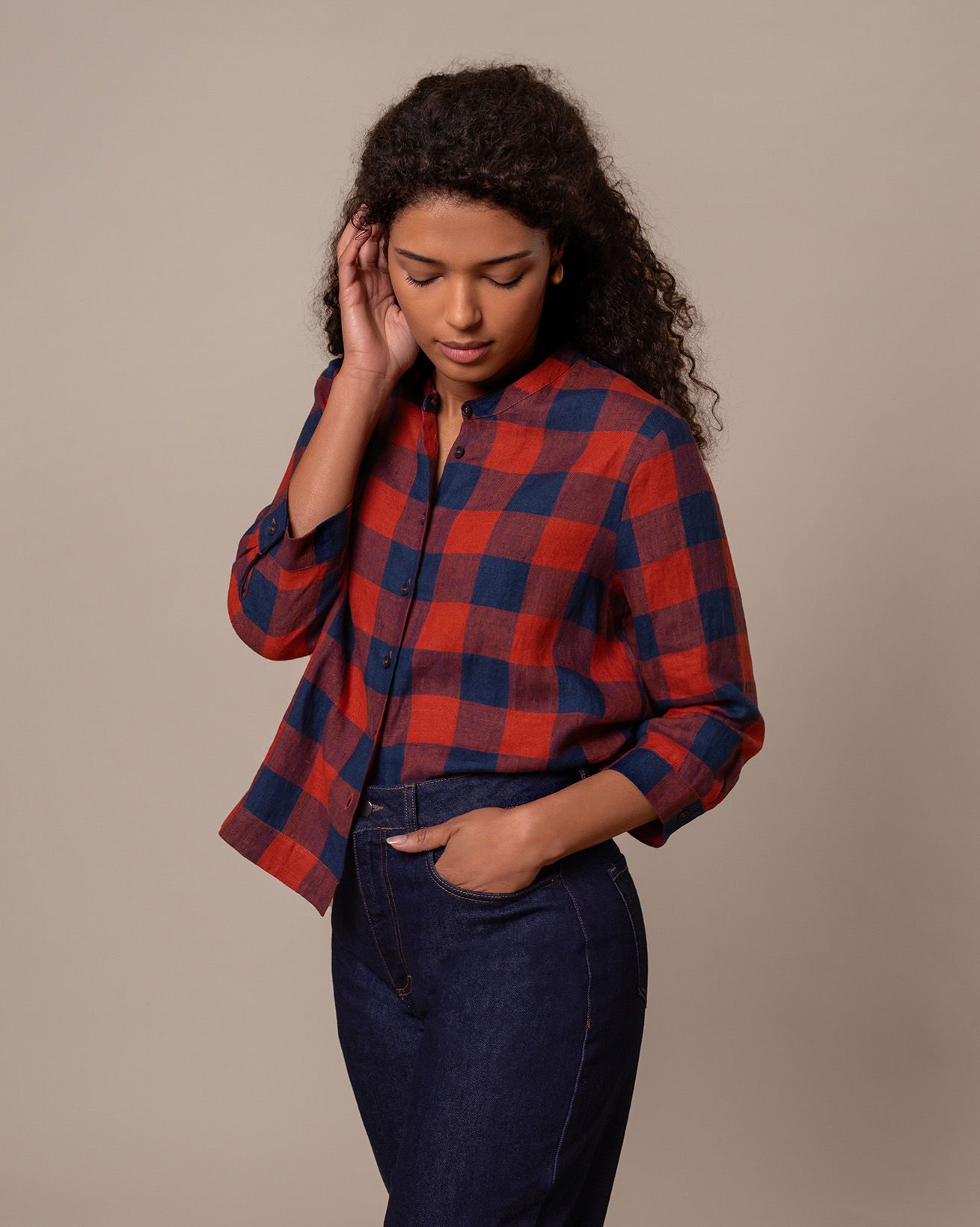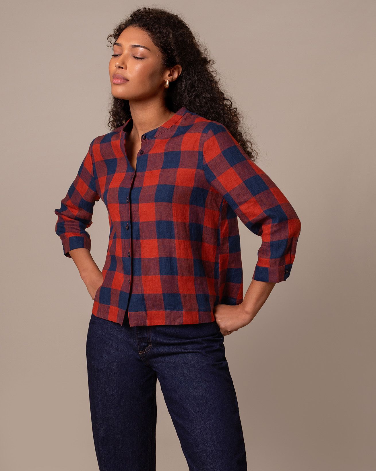 This blouse showcases a grandad collar neckline and a flattering swing shape, complemented by bracelet-length sleeves. Made from linen, it combines breathability with style, perfect for warm days or layered looks throughout the seasons.