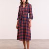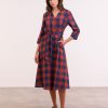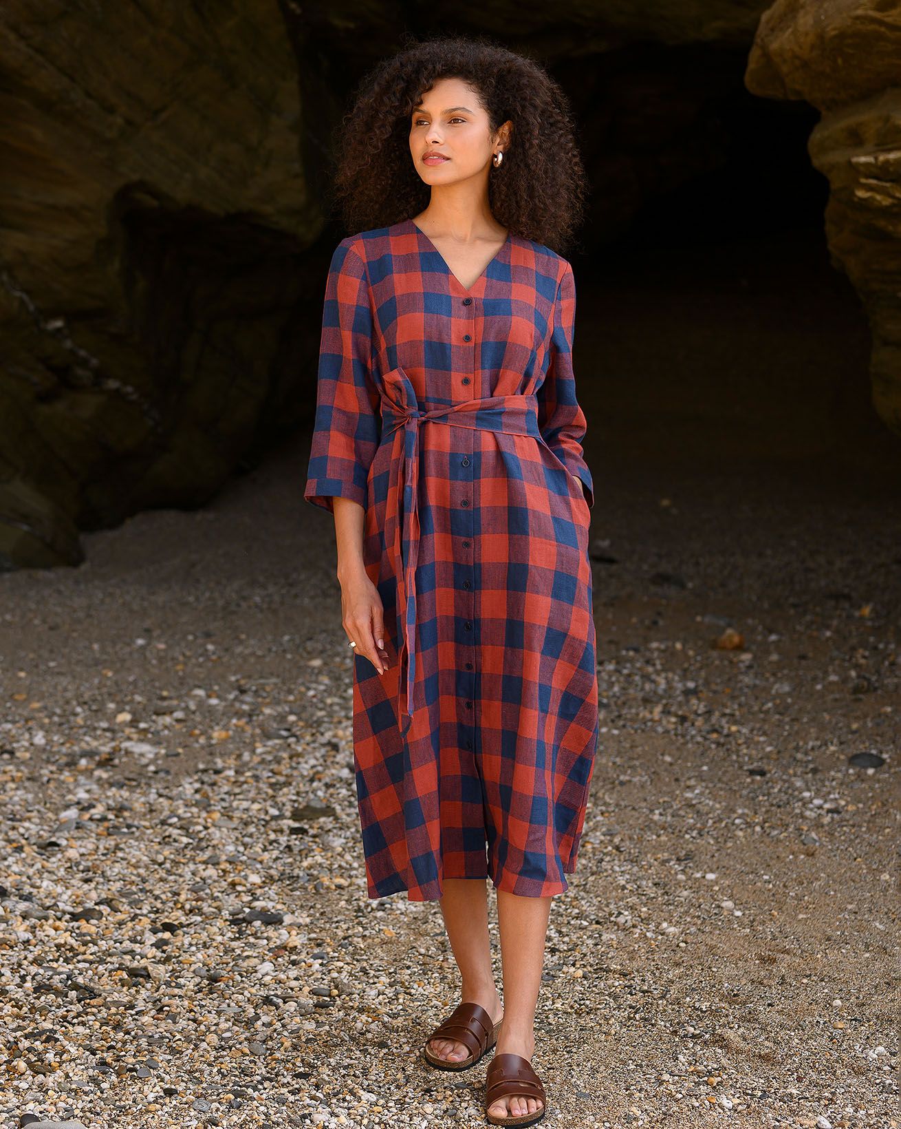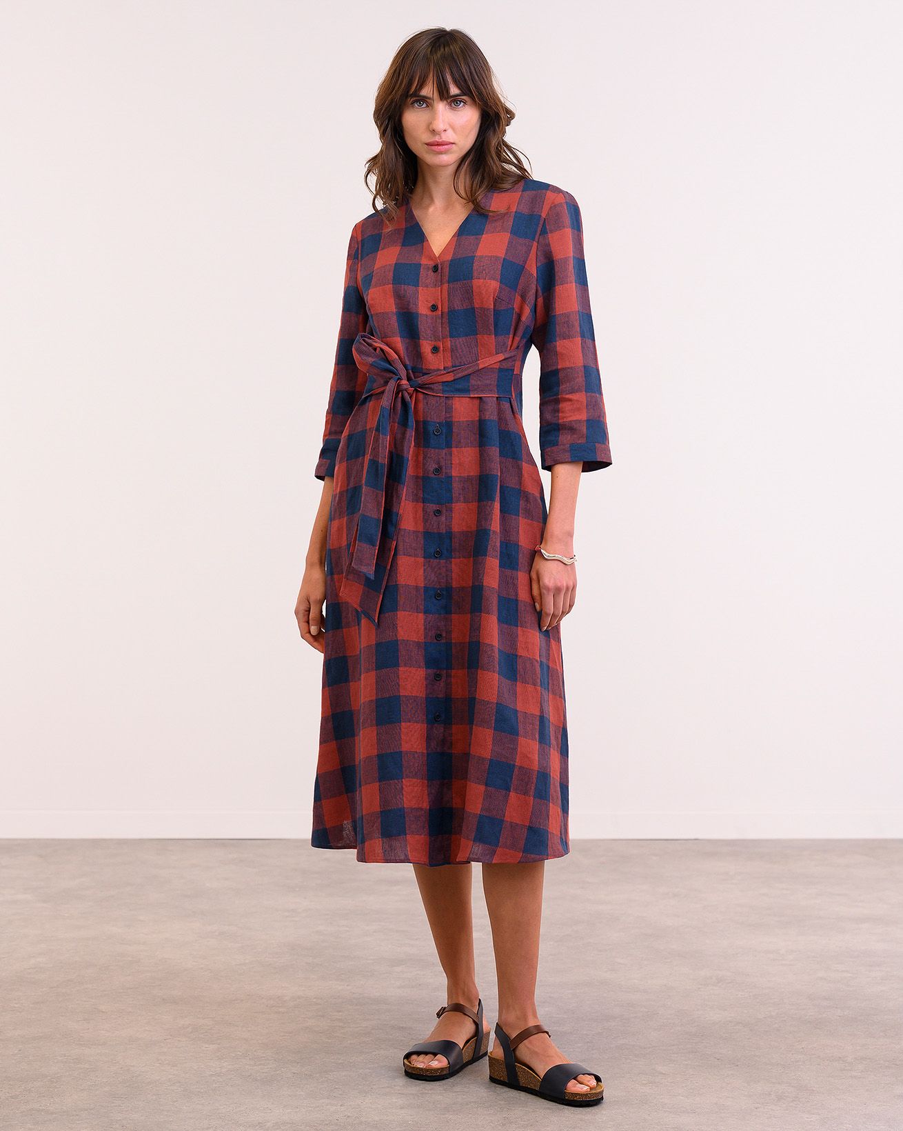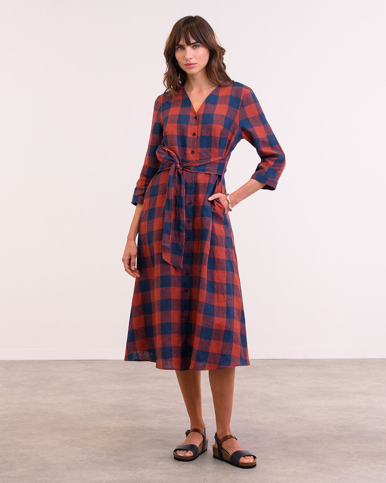 This midi shirt dress features a V neckline and a flattering fit and flare shape, enhanced by a wide self-tie belt. Crafted from linen, it offers breathability and comfort, making it a stylish choice for warm weather outings.