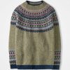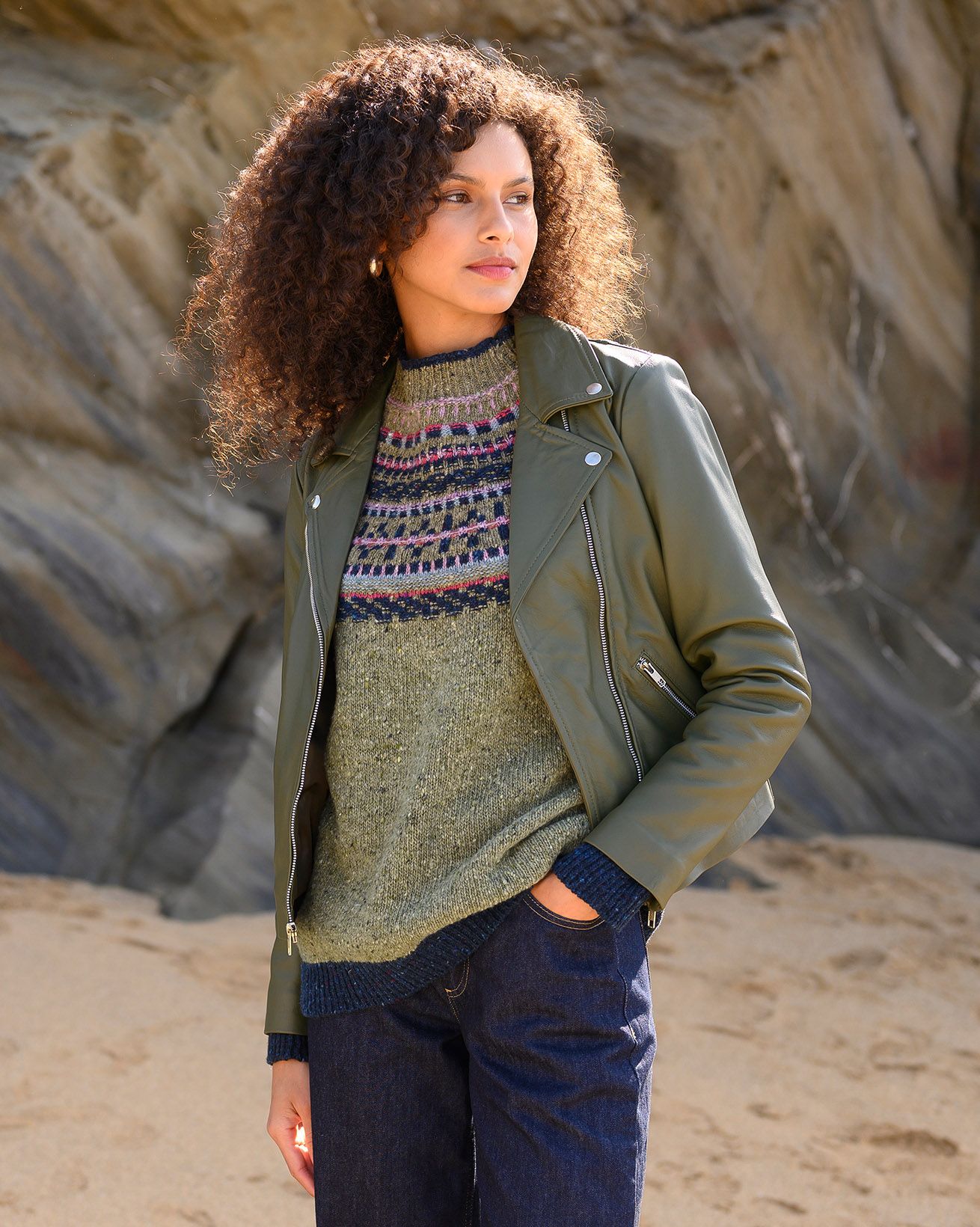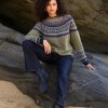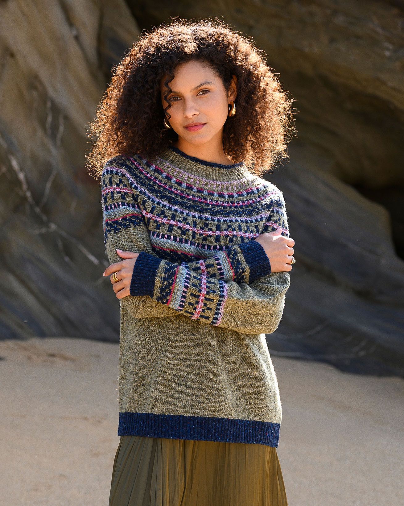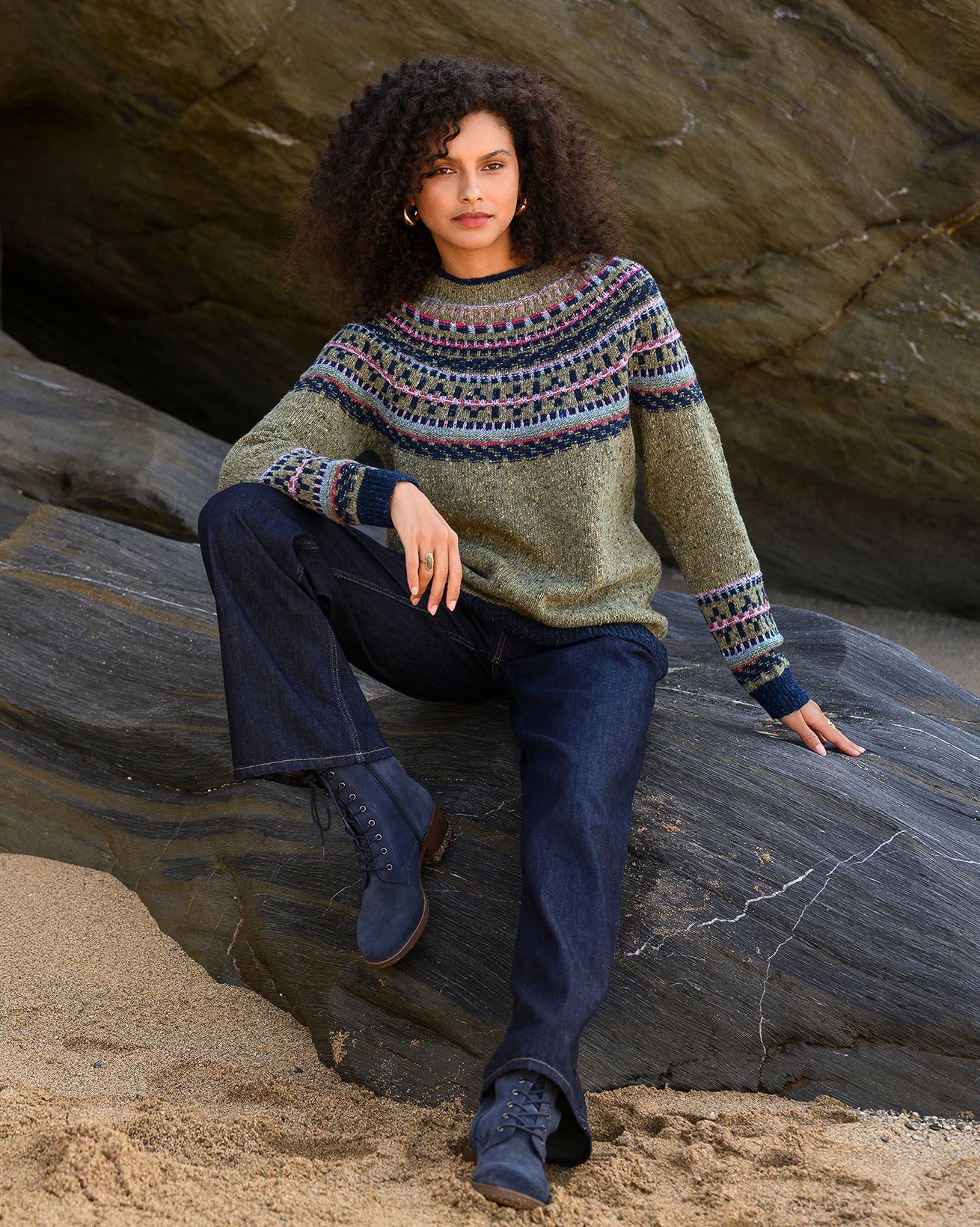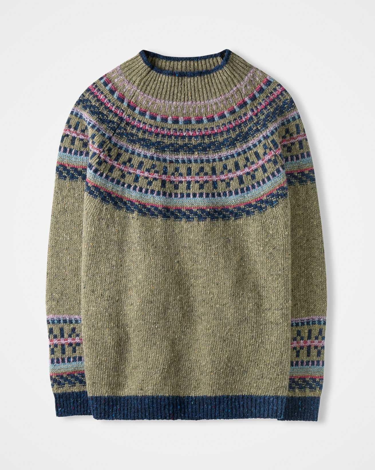This crew neckline jumper boasts a boxy fit, highlighted by a beautifully crafted Fair Isle patterned stitched yoke detail. It combines traditional craftsmanship with modern comfort, making it a timeless addition to your knitwear collection.