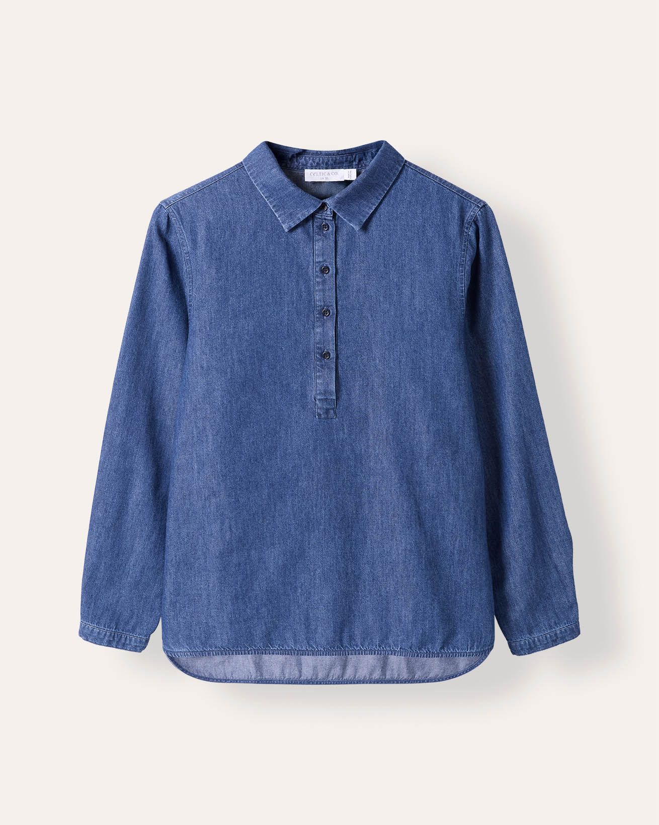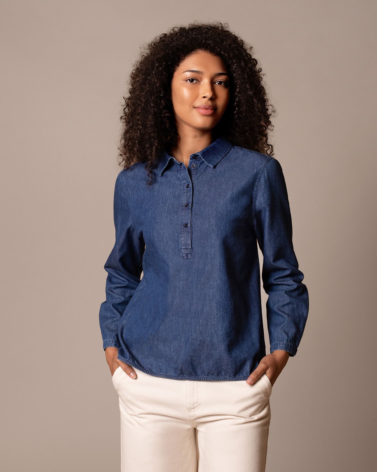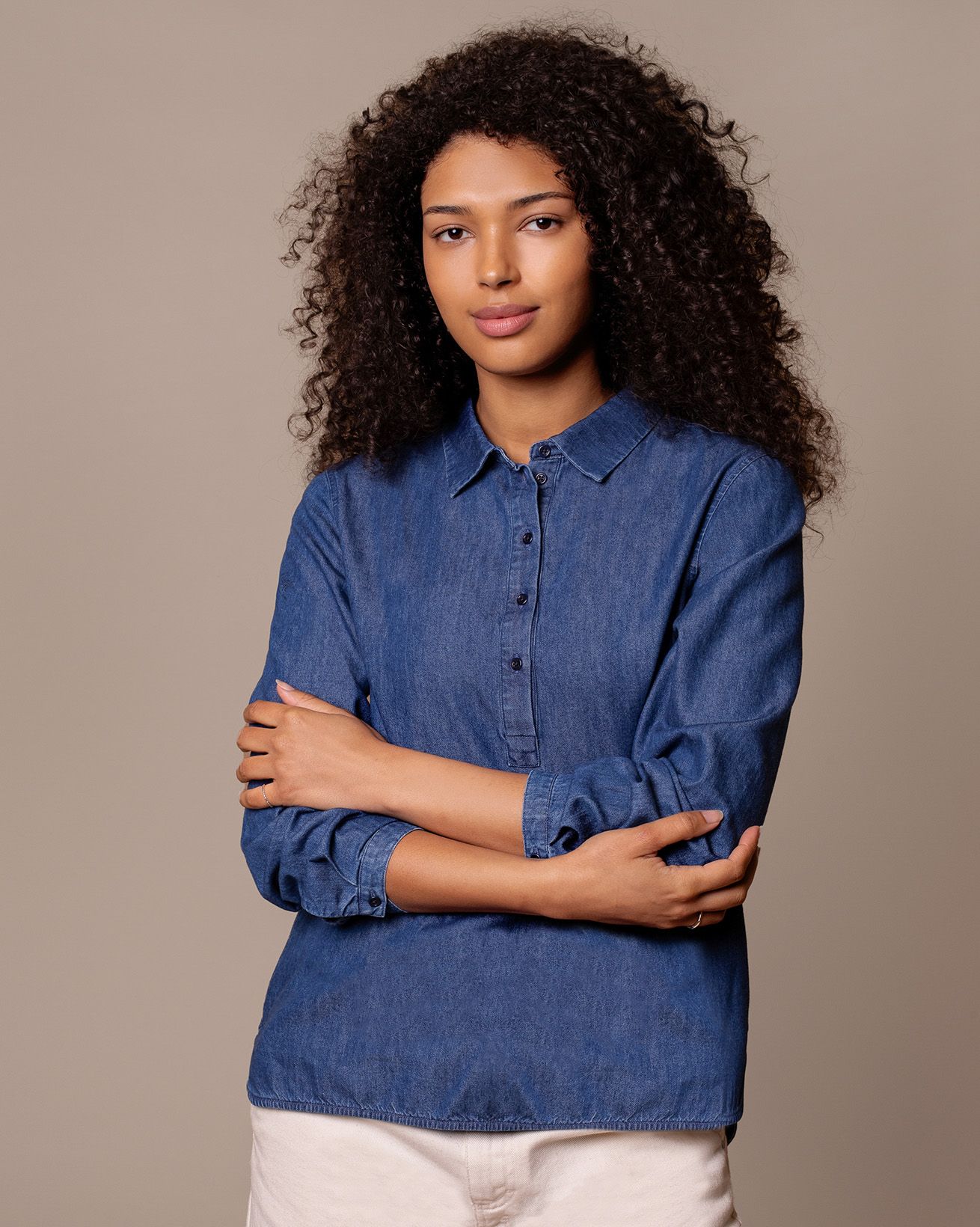 Crafted from a soft cotton-Tencel blend, this indigo-dyed chambray shirt features a shirt collar and half placket with corozo buttons. Garment stonewashed for a relaxed finish, it’s cut with a curved hem for a clean, laid-back silhouette.