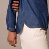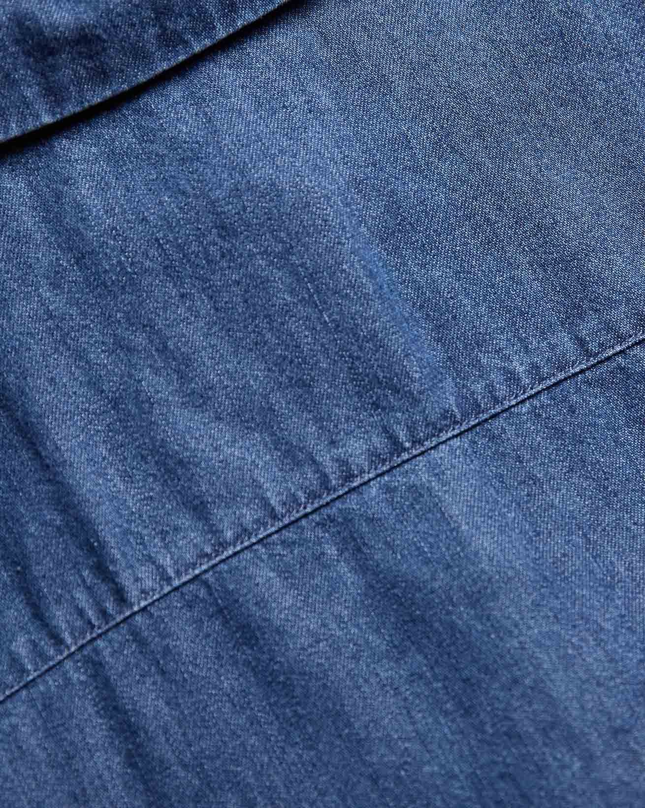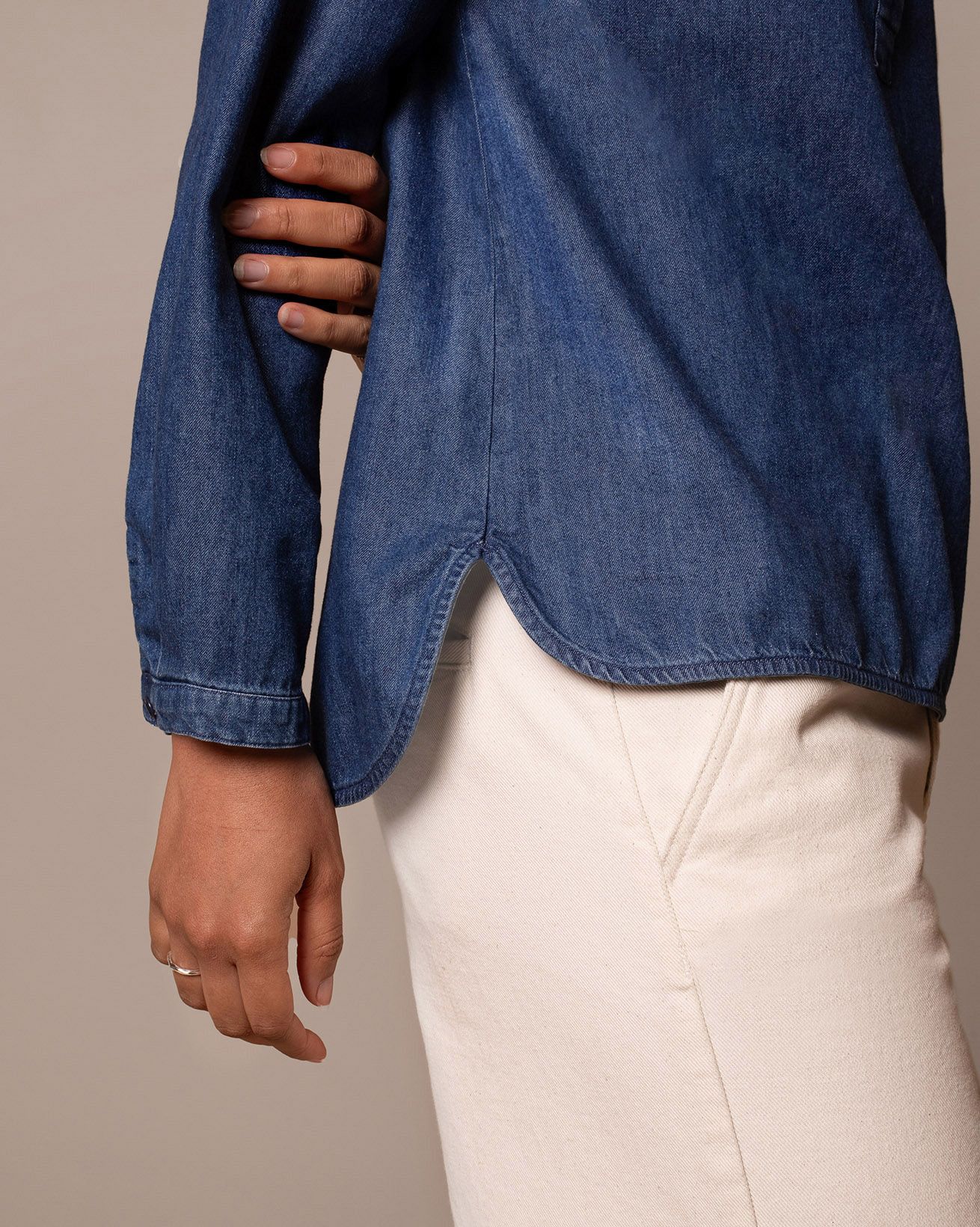 Cotton Tencel Chambray, woven in Portugal and dyed with indigo, offers a soft yet durable finish. Stonewashing creates unique colour variations, adding character and depth to each garment.