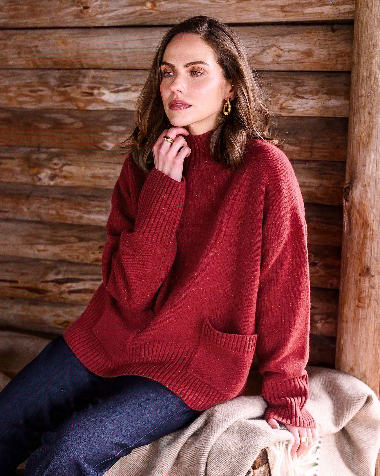 The minimal style of this lovely jumper allows the beautifully flecked yarn to sing. Crafted from wool, it is warm, soft and breathable, and features patch pockets on the front and a chunky, ribbed, funnel neck collar. The boxy shape is accentuated by the drop shoulder and details include ribbing at the cuff and hem. A great everyday jumper for all occasions.