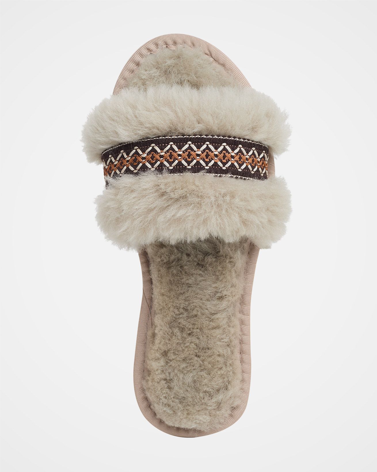 This cosy slide is crafted for comfort with its plush sheepskin design. The braid trim across the strap adds a special detail. Perfect for relaxed days, these slides effortlessly combine comfort and understated style.