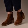 Leather ankle boots featuring an elasticated side panel and seamed toe detail. They are designed with a block heel and a slight platform sole, both made from crepe rubber.