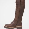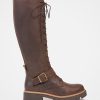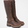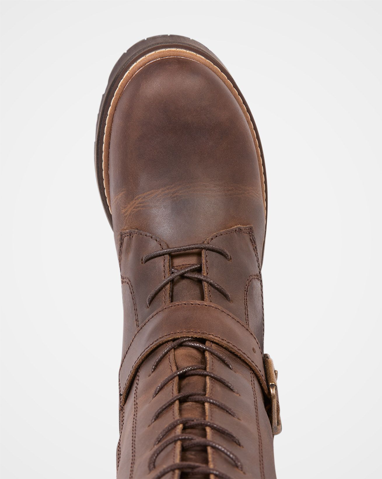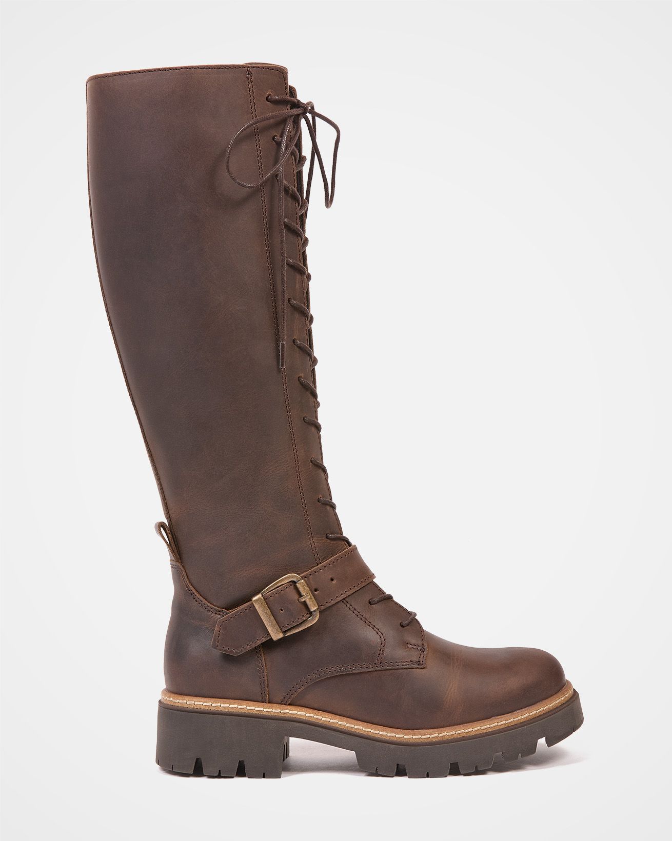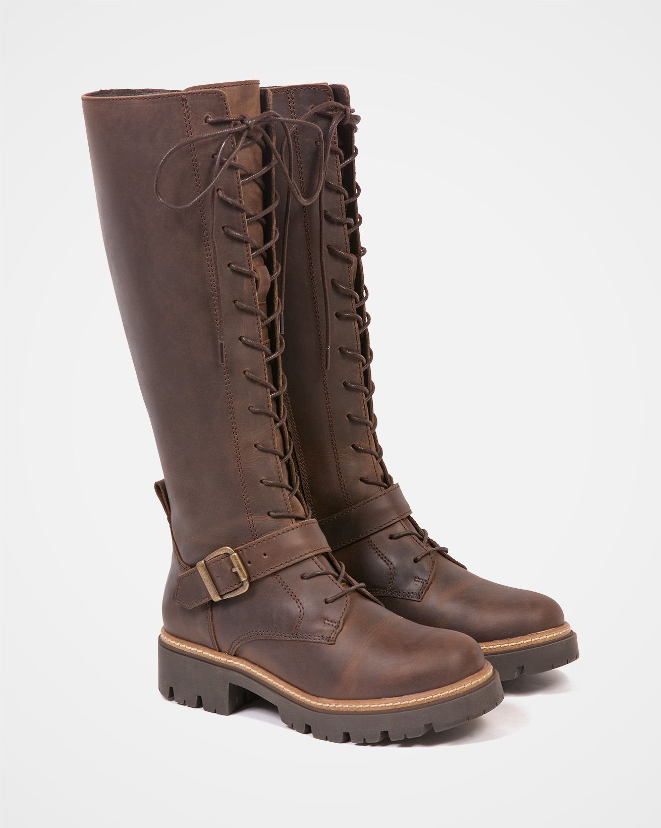 Featuring leather or suede for the upper, these knee-high boots offer lace-up detailing complemented by buckle and strap accents at the ankle. The leather lining adds comfort, while the chunky cleated sole with a contrast welt provides a sturdy and distinctive finish.