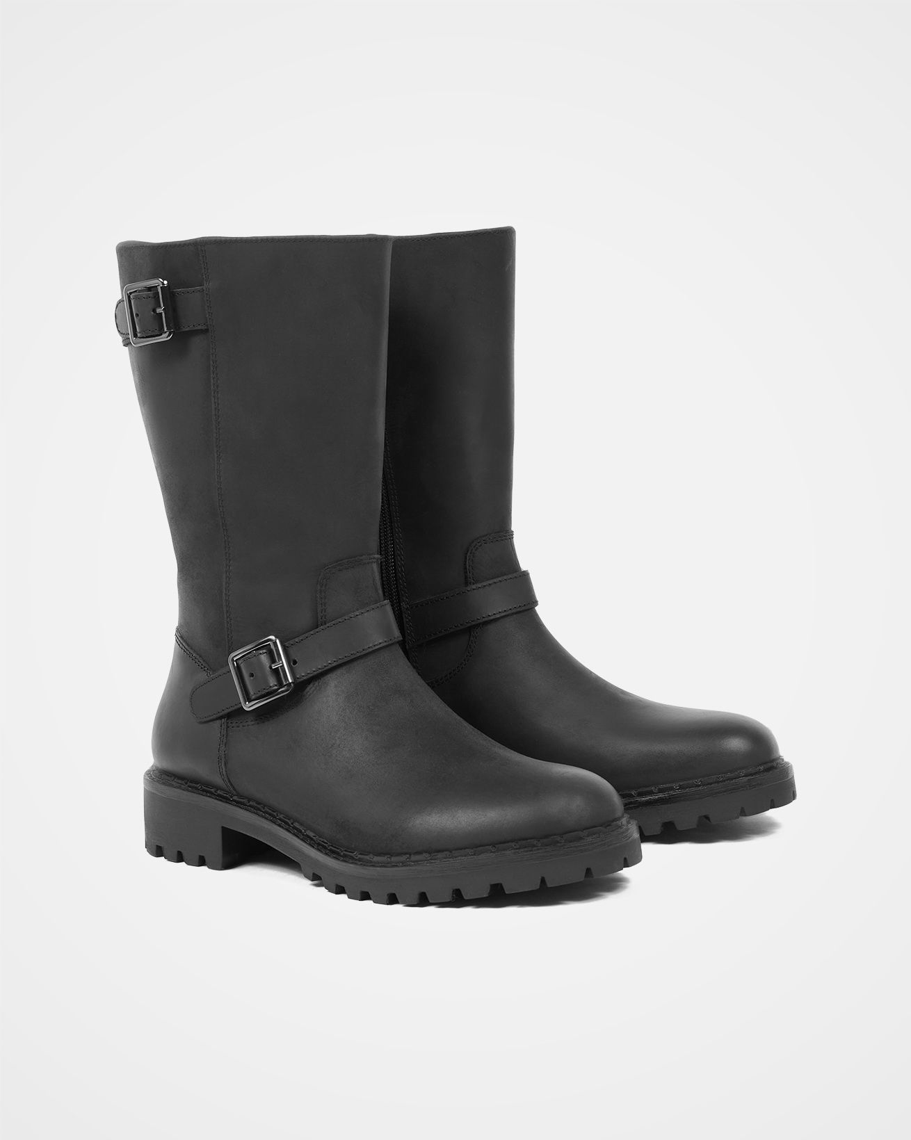 Featuring a leather upper, these Mid-Calf Biker Boots come with buckle and strap detailing. The leather lining and zip opening ensure easy dressing and comfort.