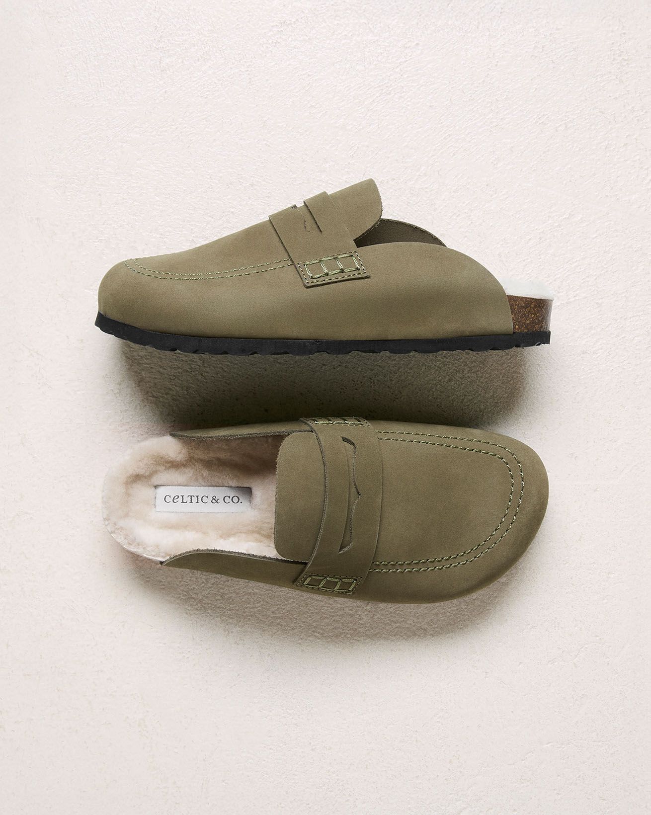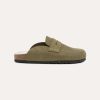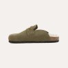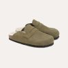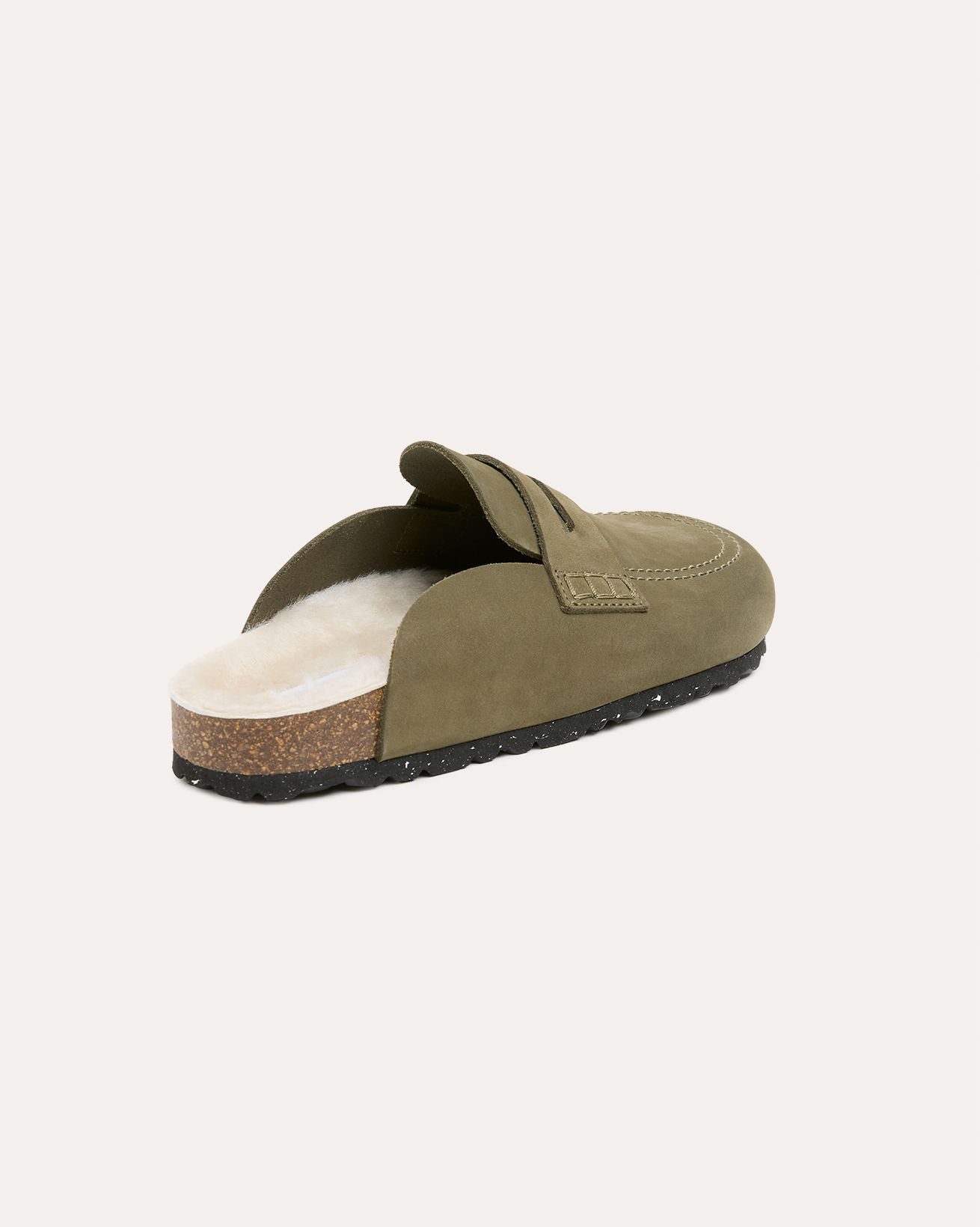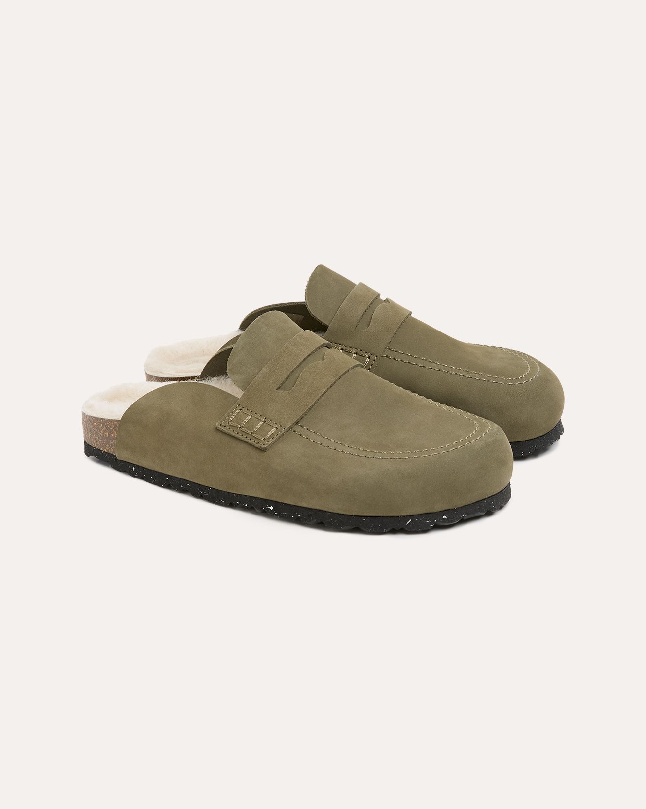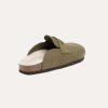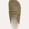 Penny loafer detailed slip-on clogs feature a Cow Nubuck upper. The insole is luxuriously lined with real sheepskin, complemented by a cork midsole and an outsole made from EVA.