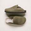 Penny loafer detailed slip-on clogs feature a Cow Nubuck upper. The insole is luxuriously lined with real sheepskin, complemented by a cork midsole and an outsole made from EVA.