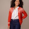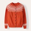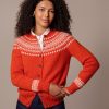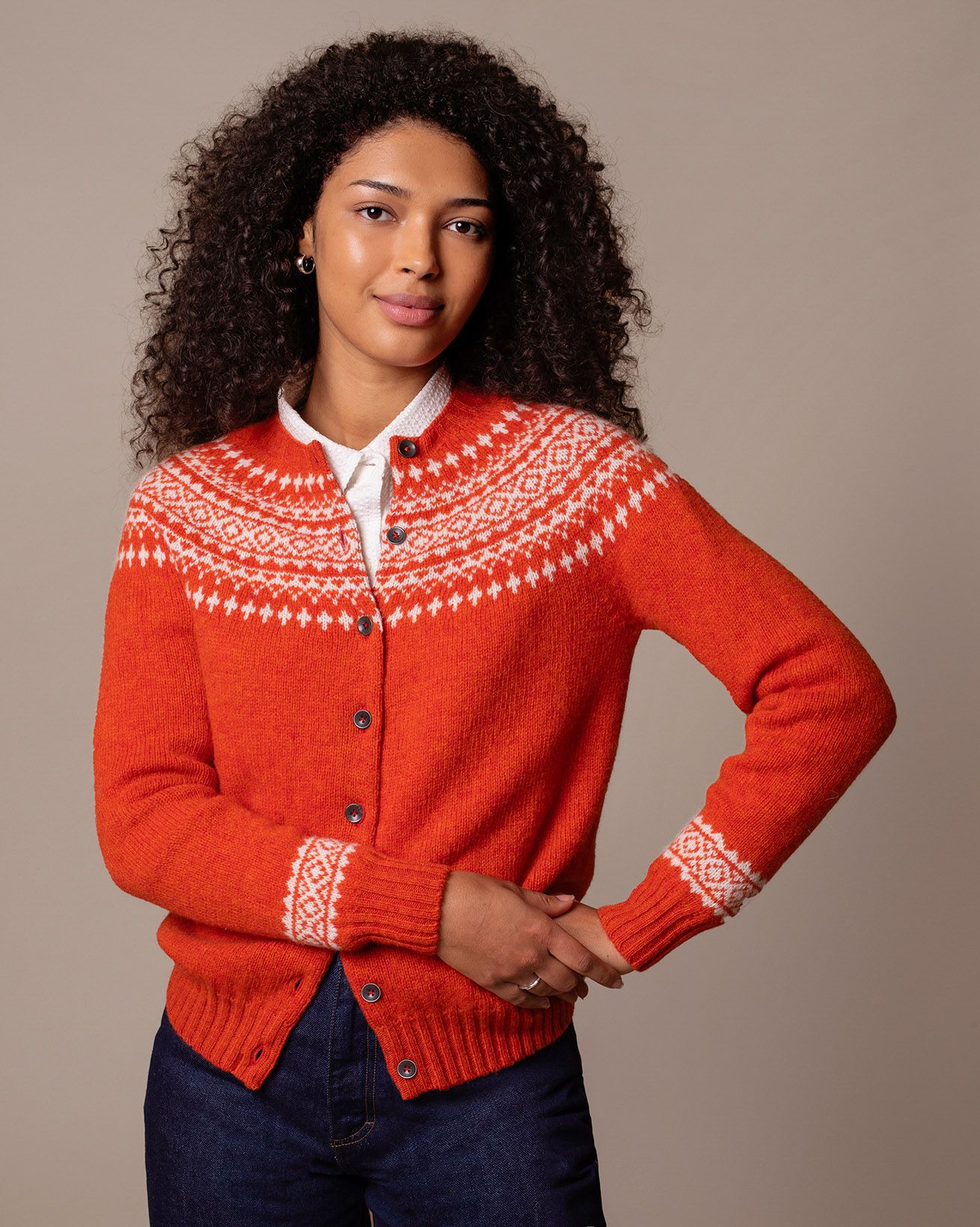 Made in Britain by Harley of Scotland, this Fair Isle cardigan is crafted from pure new wool and features a two-colour yoke design. With a crew neckline, neat fit, ribbed hems, and UK-made corozo buttons, it blends traditional craftsmanship with everyday wearability.