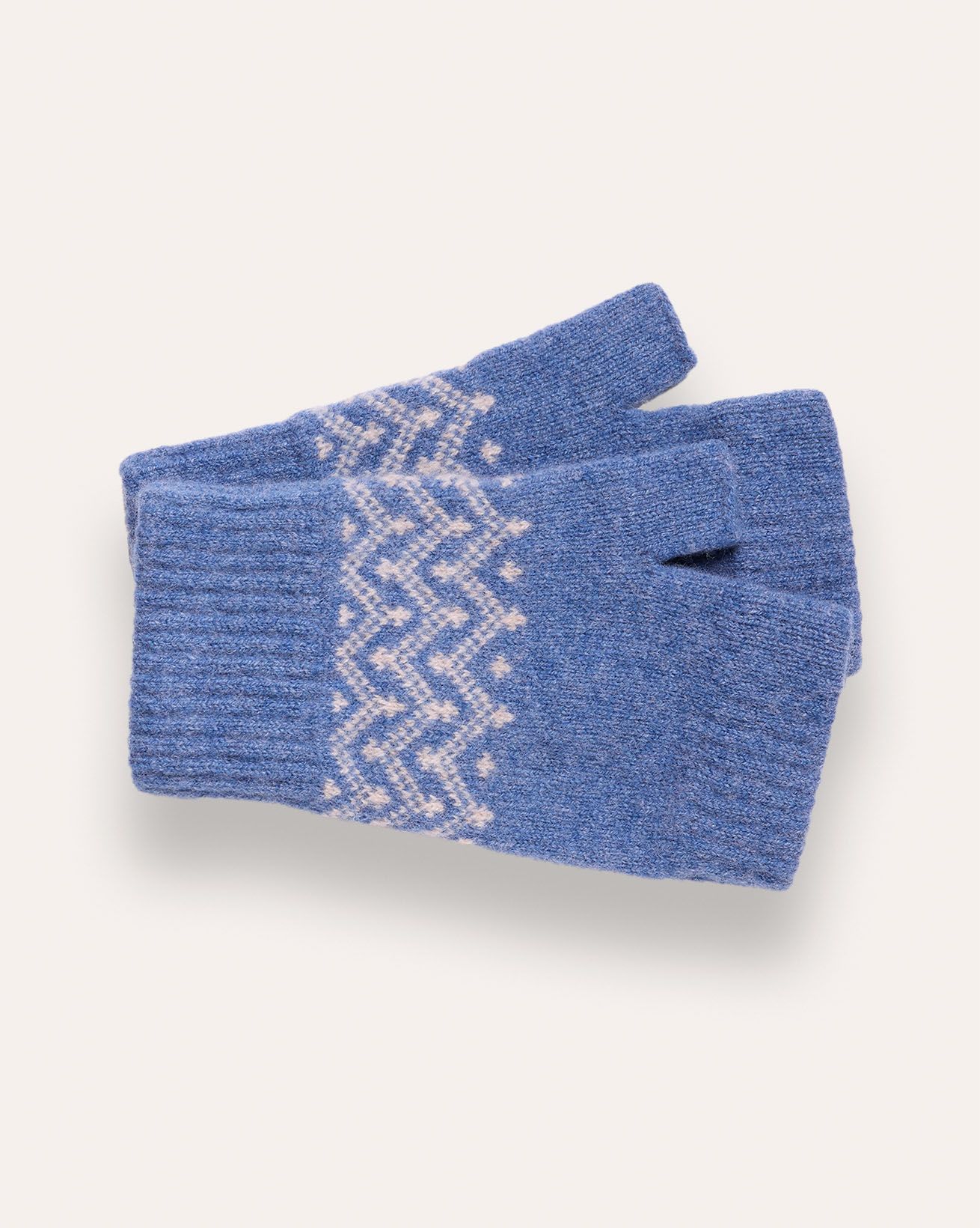 These fingerless gloves, crafted in Britain from Lambswool, feature a two-colour ripple pattern fair isle design. They can be styled with the matching Lambswool Ripple Fair Isle Bobble Hat and Snood.