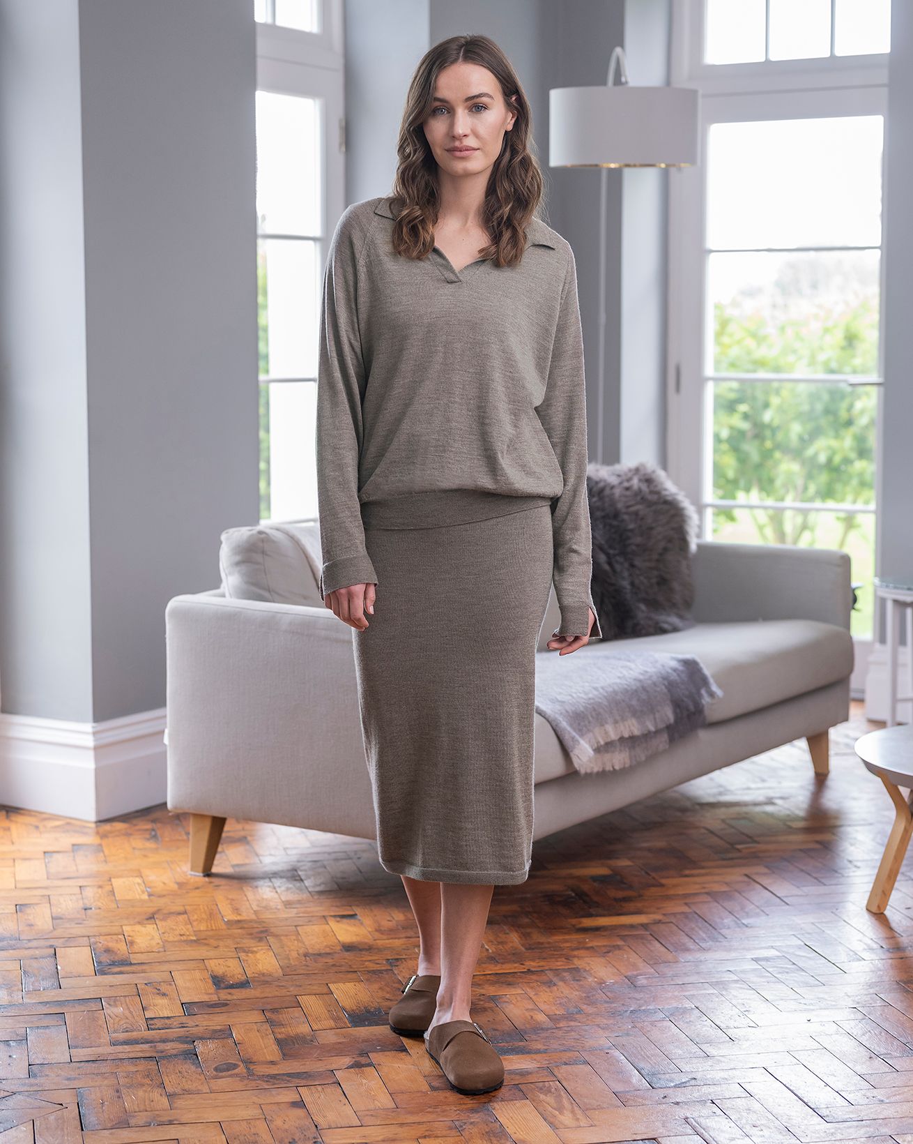 Brand new for the season, our beautiful skirt is crafted right here in the UK from pure Merino yarns and cut with a midi length that falls around mid calf.