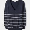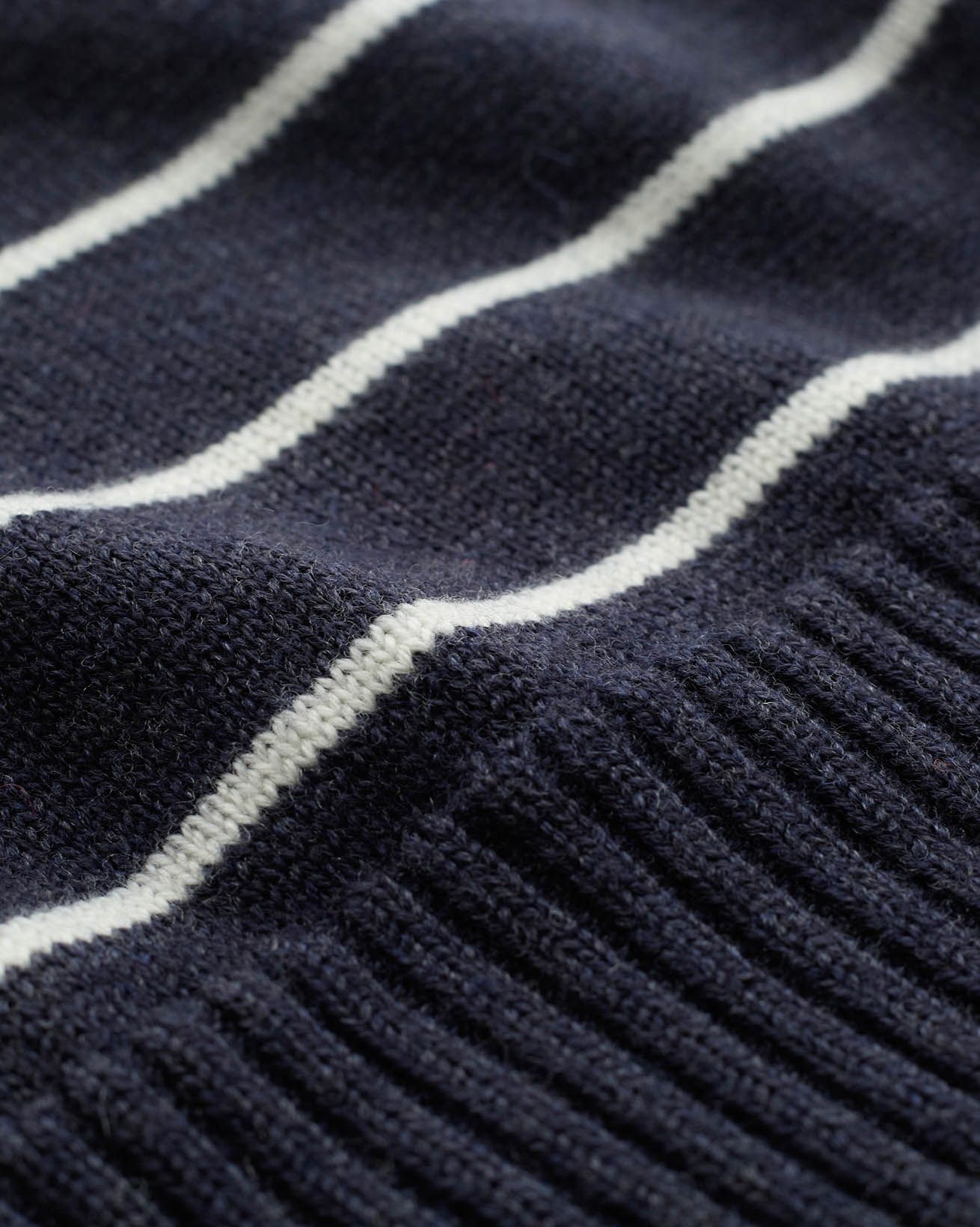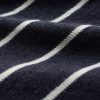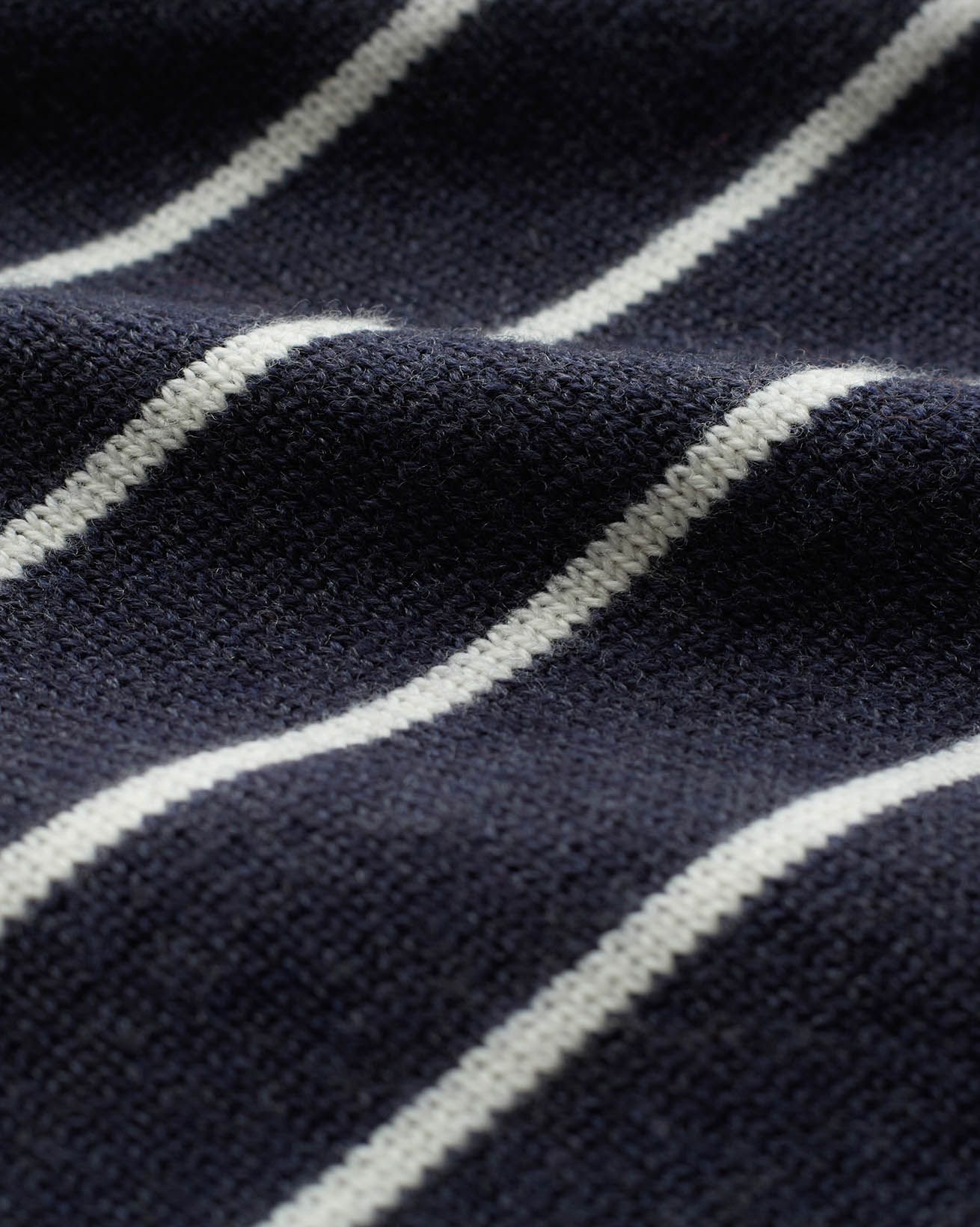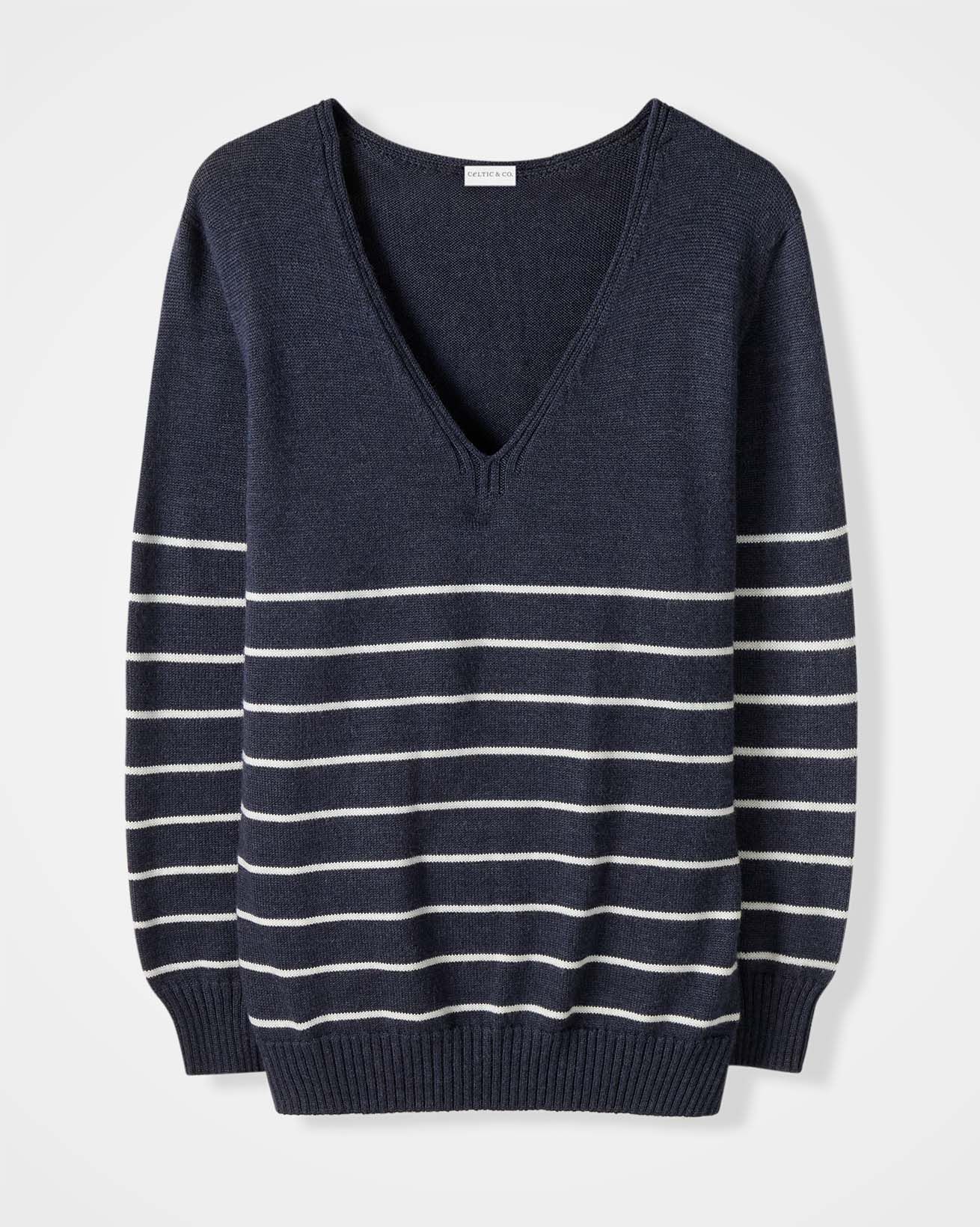 Our Merino V Neck Jumper has been seamlessly knitted in Britain with full-length sleeves and a ribbed hem and cuffs. The clean, luxury handle of the merino wool offers warmth to a traditional v-neck style in a contemporary breton stripe design. Whether you’re layering up for the evening or keeping it casual, this jumper is a versatile choice for any occasion.