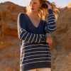 Our Merino V Neck Jumper has been seamlessly knitted in Britain with full-length sleeves and a ribbed hem and cuffs. The clean, luxury handle of the merino wool offers warmth to a traditional v-neck style in a contemporary breton stripe design. Whether you’re layering up for the evening or keeping it casual, this jumper is a versatile choice for any occasion.