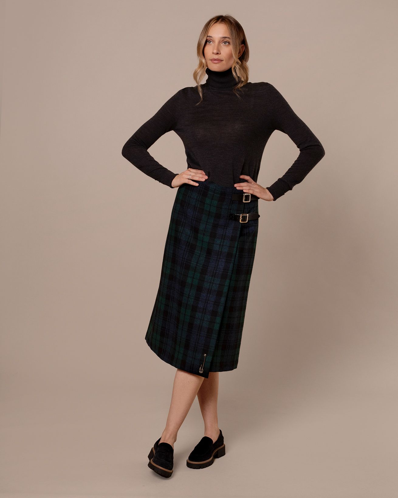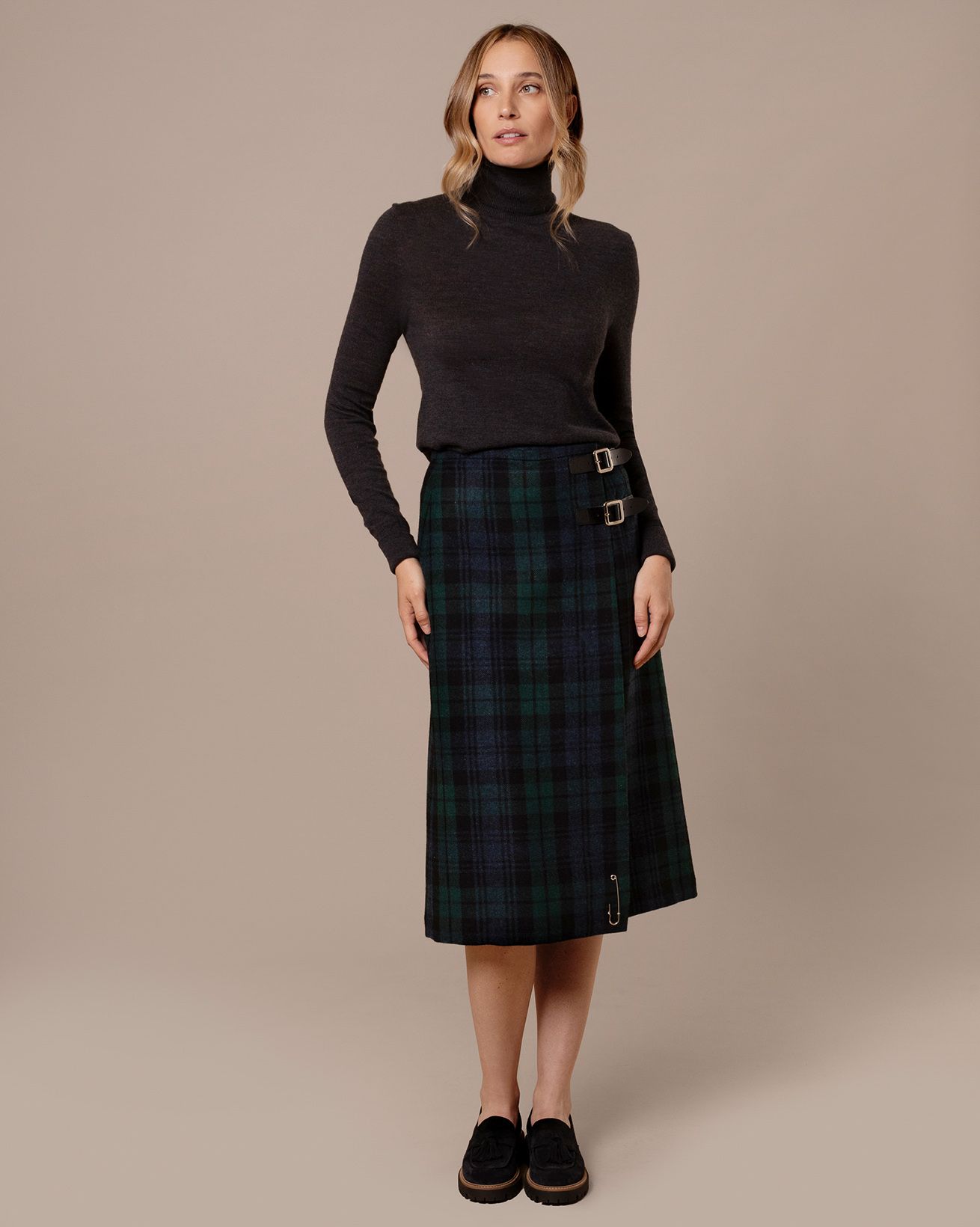 Our best-loved kilt but in a trending midi length to fall around mid calf. The longer cut makes this the ideal foundation for building a modern winter look with hints of the traditional. Expertly crafted for Celtic & Co. by one ofthe last remaining kilt manufacturers in Scotland, this fully lined kilt is made in pure wool with a wrapped design and twin leather straps for an adjustable fit at the waist.
