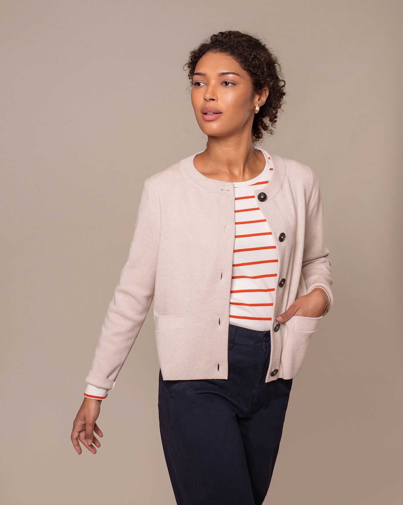 Knitted from pure cotton, this lightweight jacket features a cropped length, crew neck, and front pockets. With a slightly boxy fit and corozo buttons, it’s a versatile piece suited to smart or casual wear across seasons.