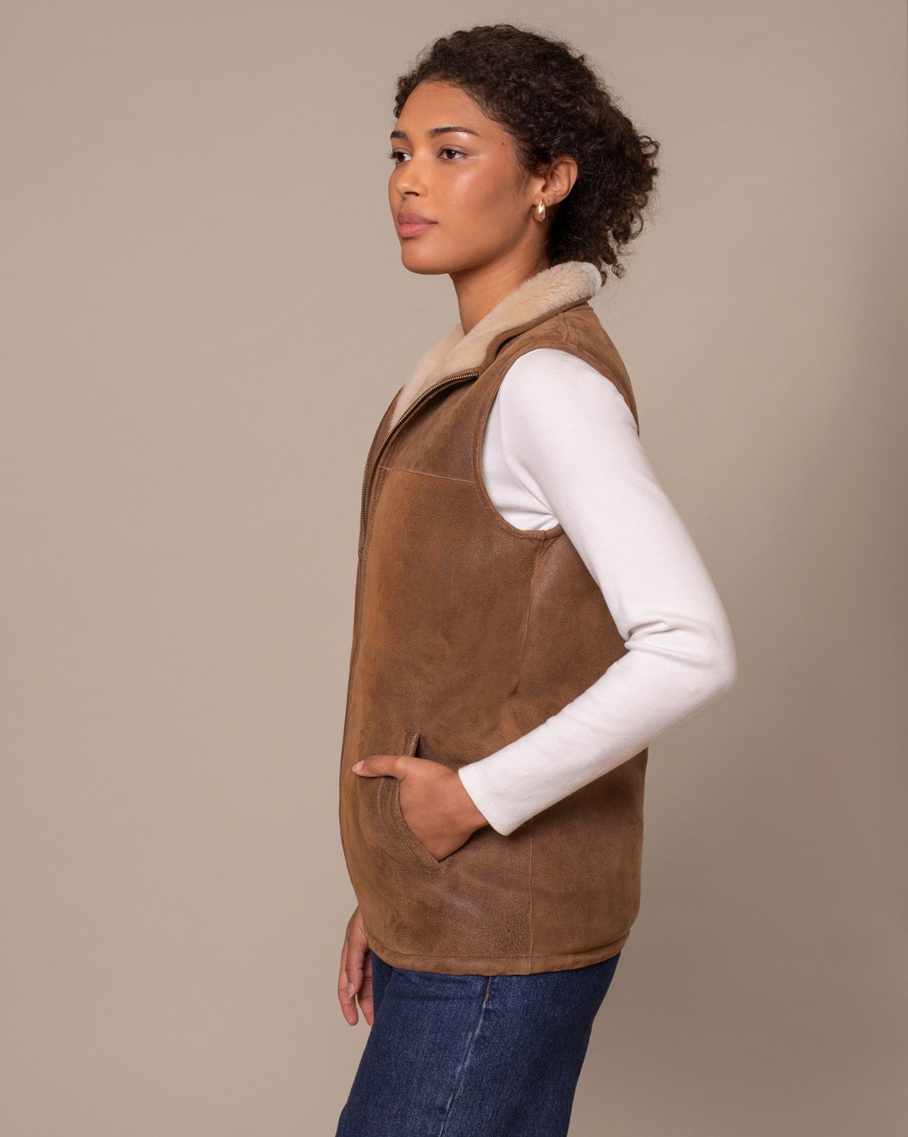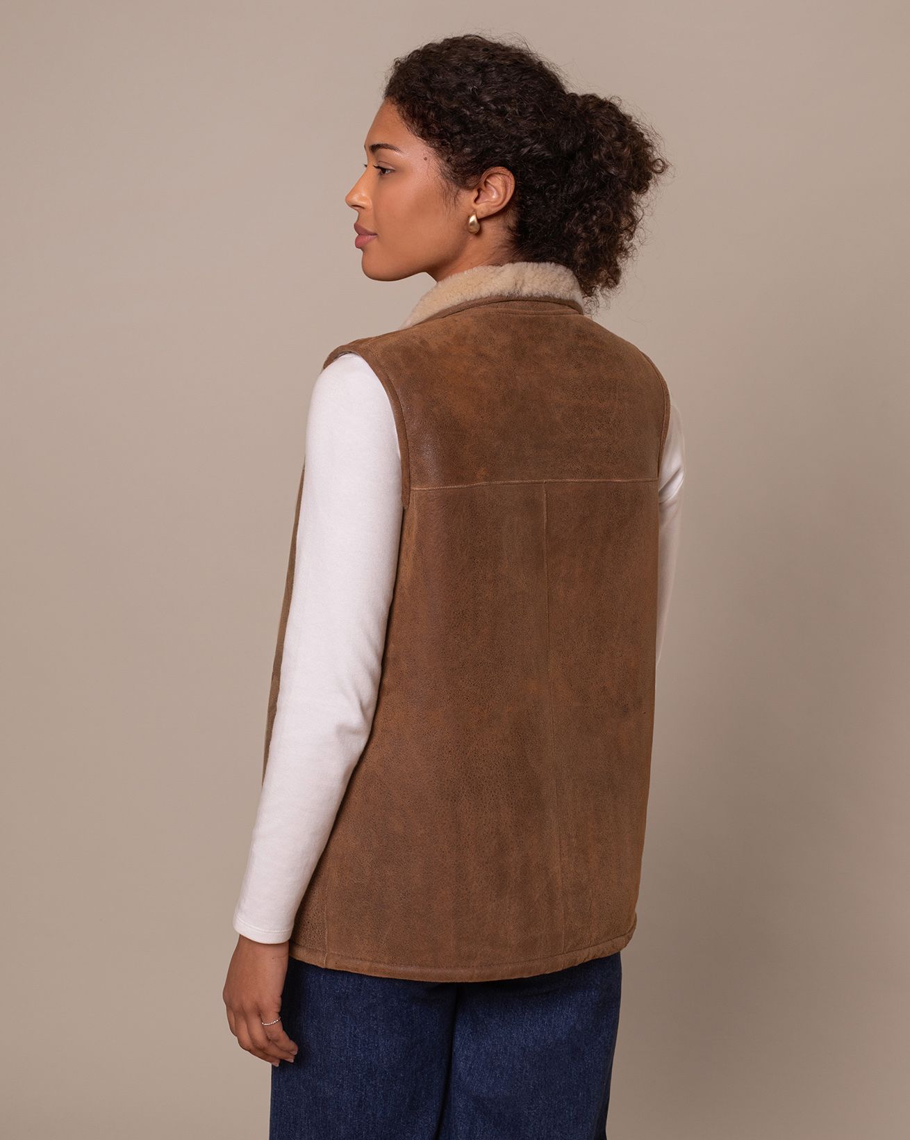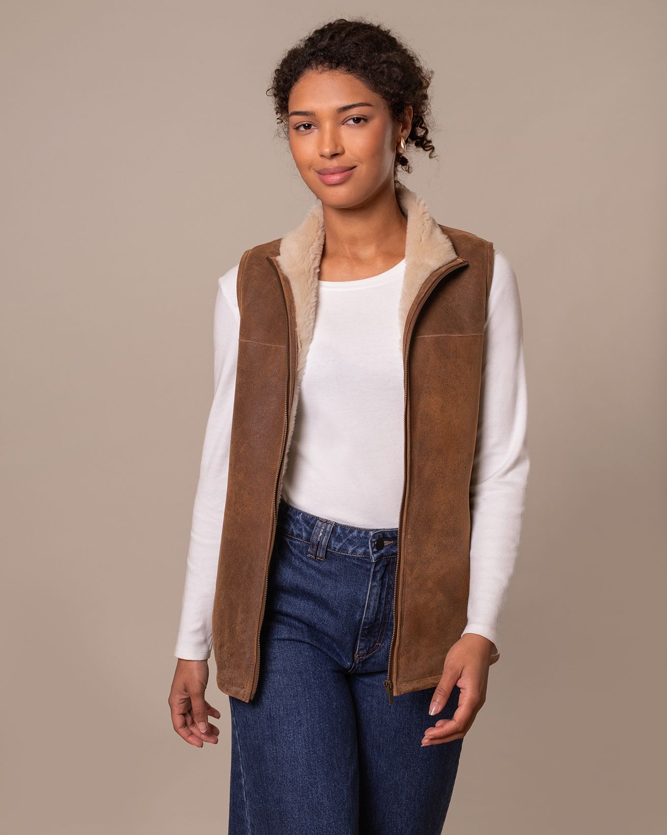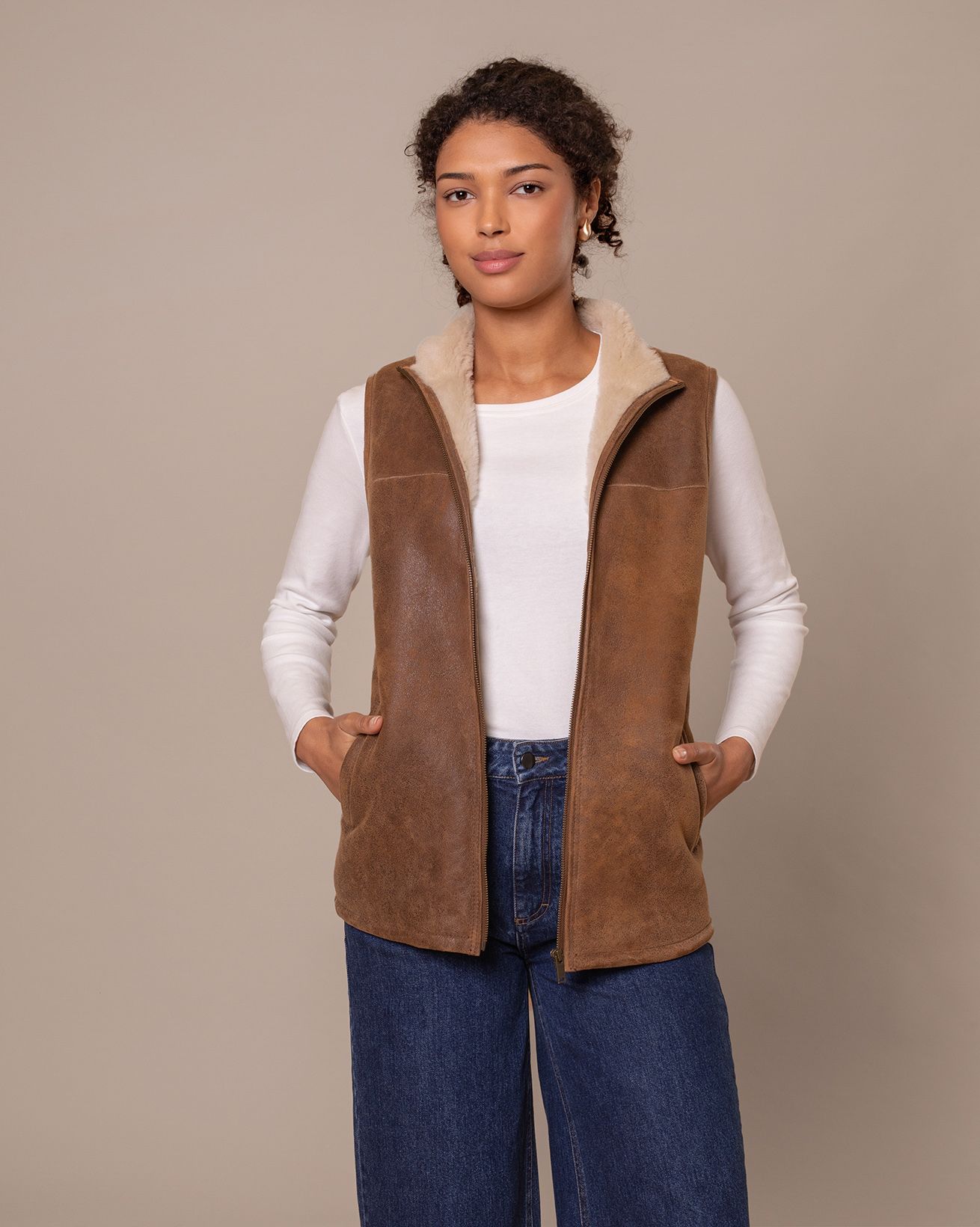 Perfect for keeping your core wonderfully warm on transitional days, our bodywarmer is crafted in luxurious sheepskin with a peached, antiqued finish at the outer.