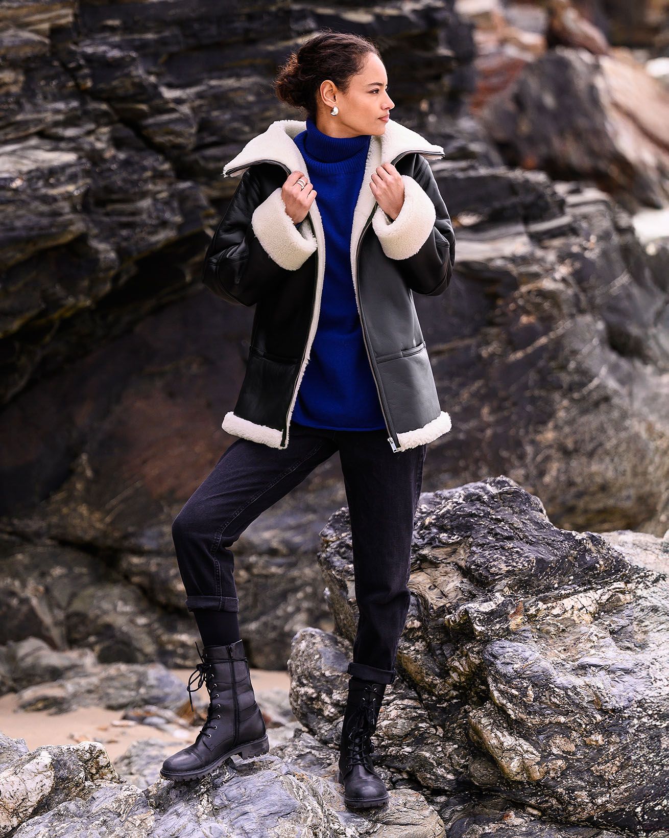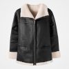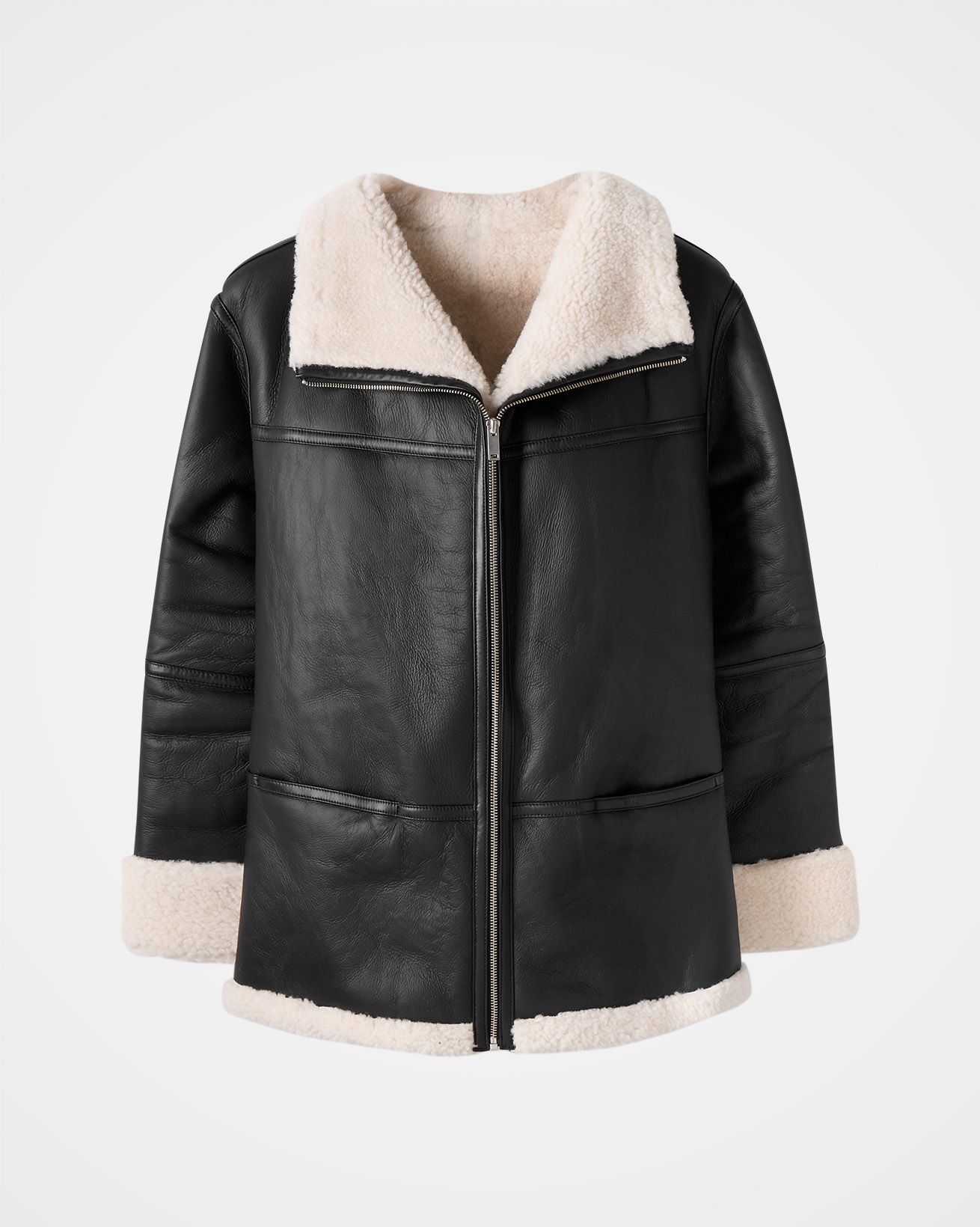 This sheepskin jacket features a funnel neckline and a relaxed, slouchy fit for casual comfort. Finished with a metal zip fastening at the front, along with pockets lined in sheepskin, combining style with functionality.