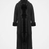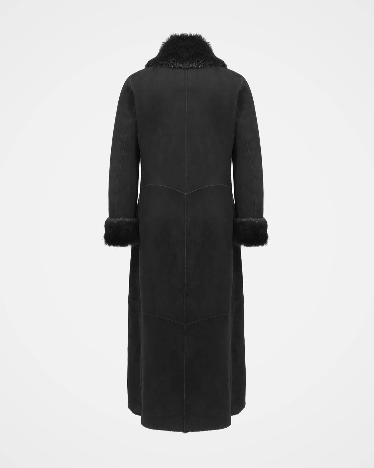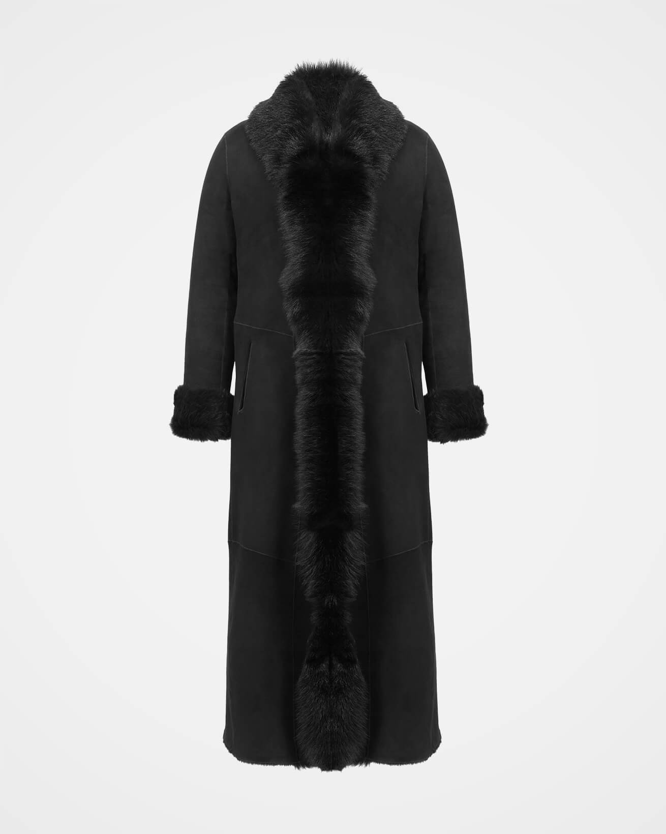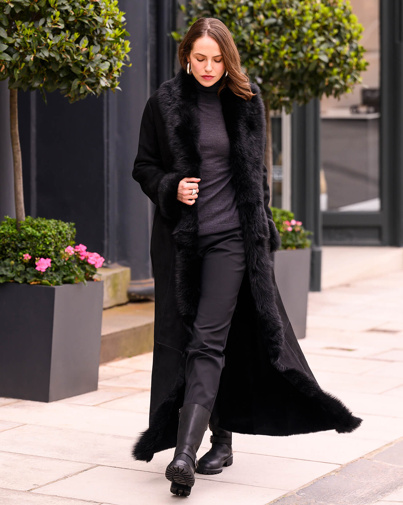 Our latest full-length toscana coat boasts a collared neckline and is crafted with shorter merino sheepskin for the body and sleeves. Long toscana sheepskin trim adorns the collar and cuffs, offering a distinctive touch and statement look. It features a hook and eye fastening and convenient side pockets.