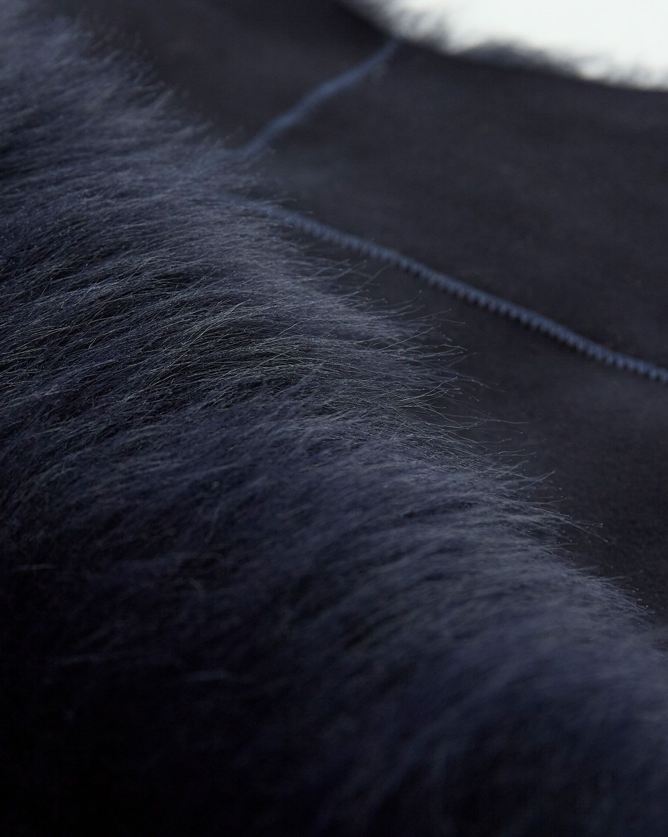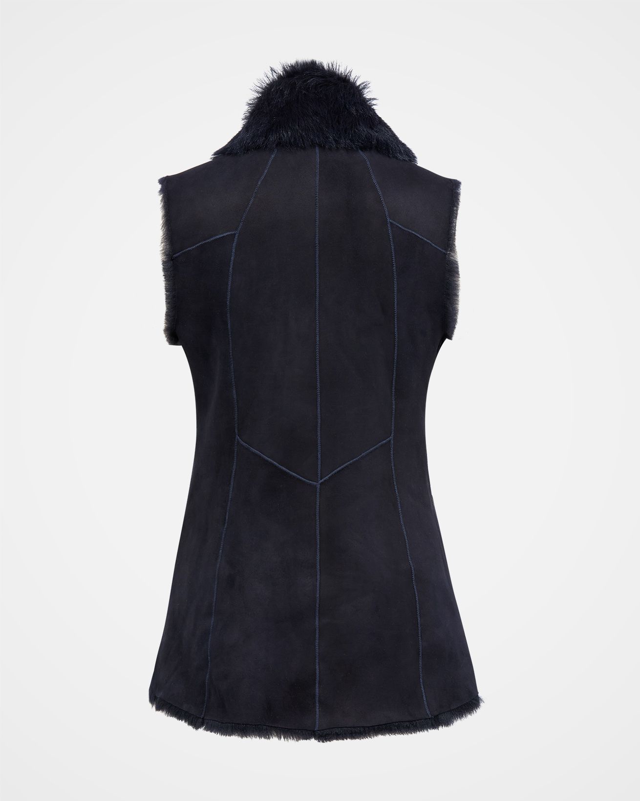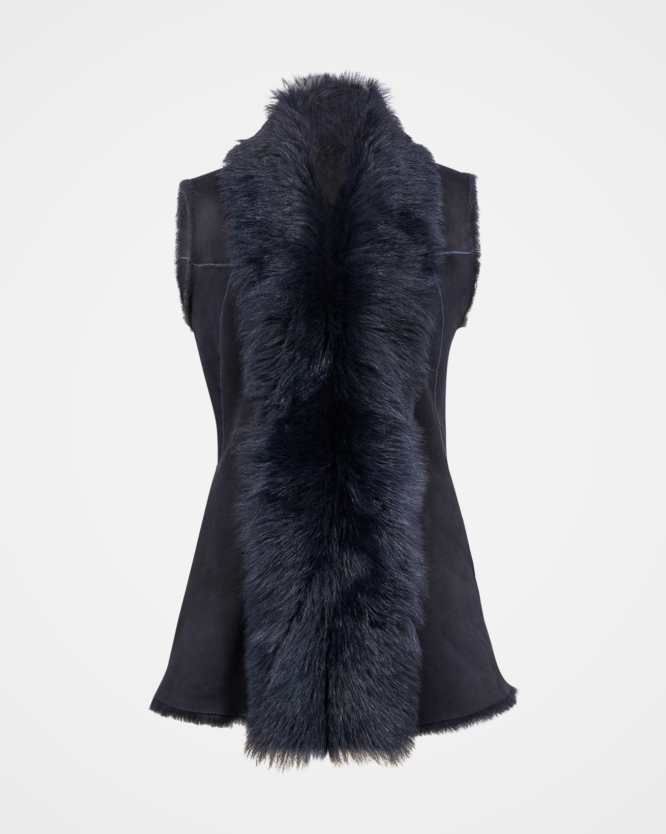 This longline gilet features a collared neckline and combines shorter merino sheepskin for the body with longer toscana sheepskin for the collar, front, and cuff trim. Finished with hook and eye fastening and side pockets, it exudes timeless appeal.