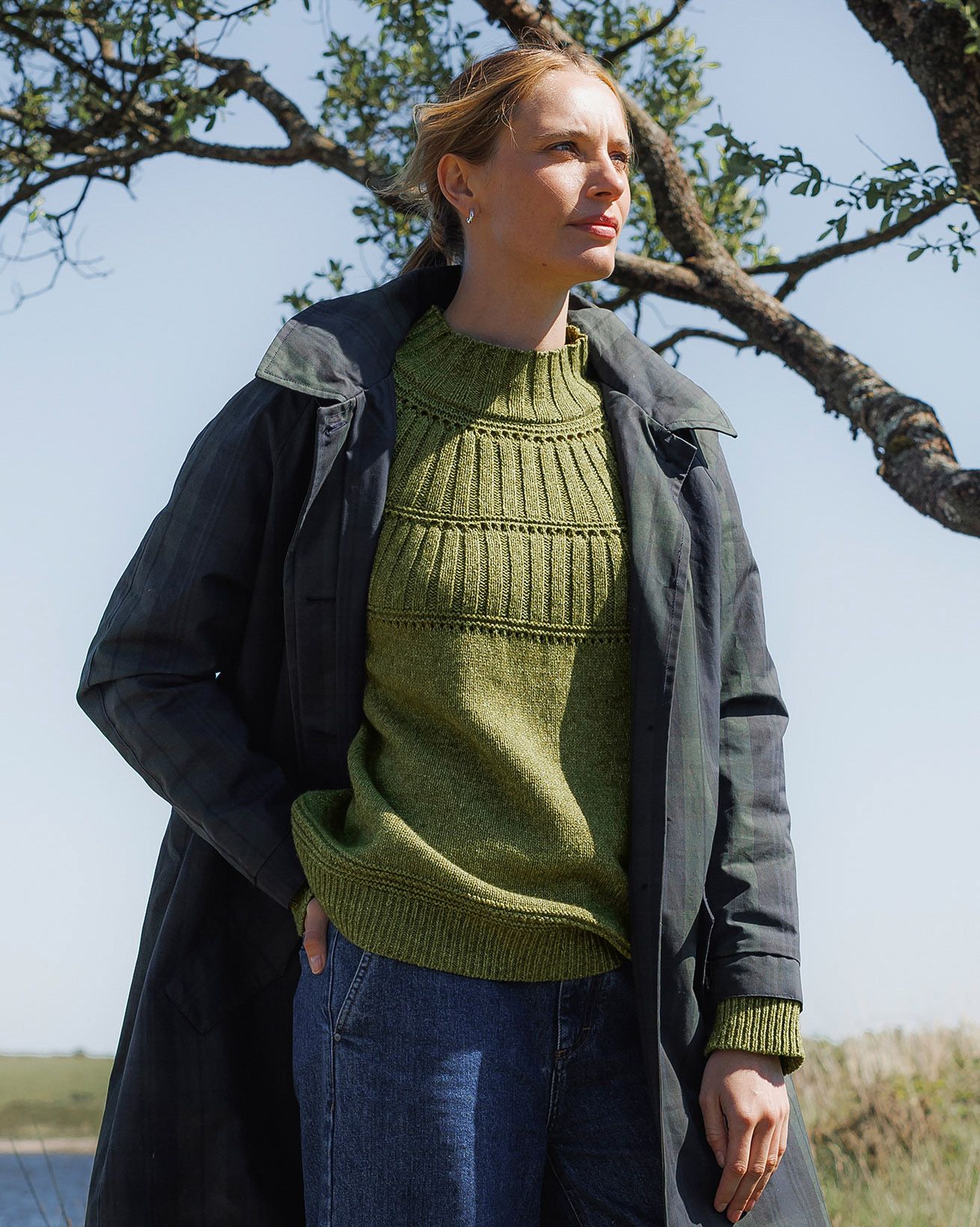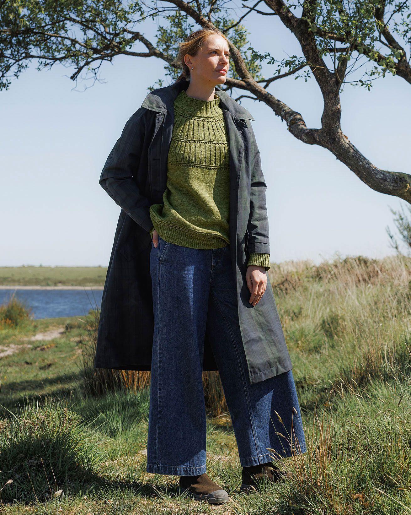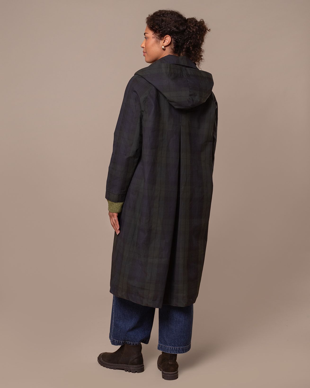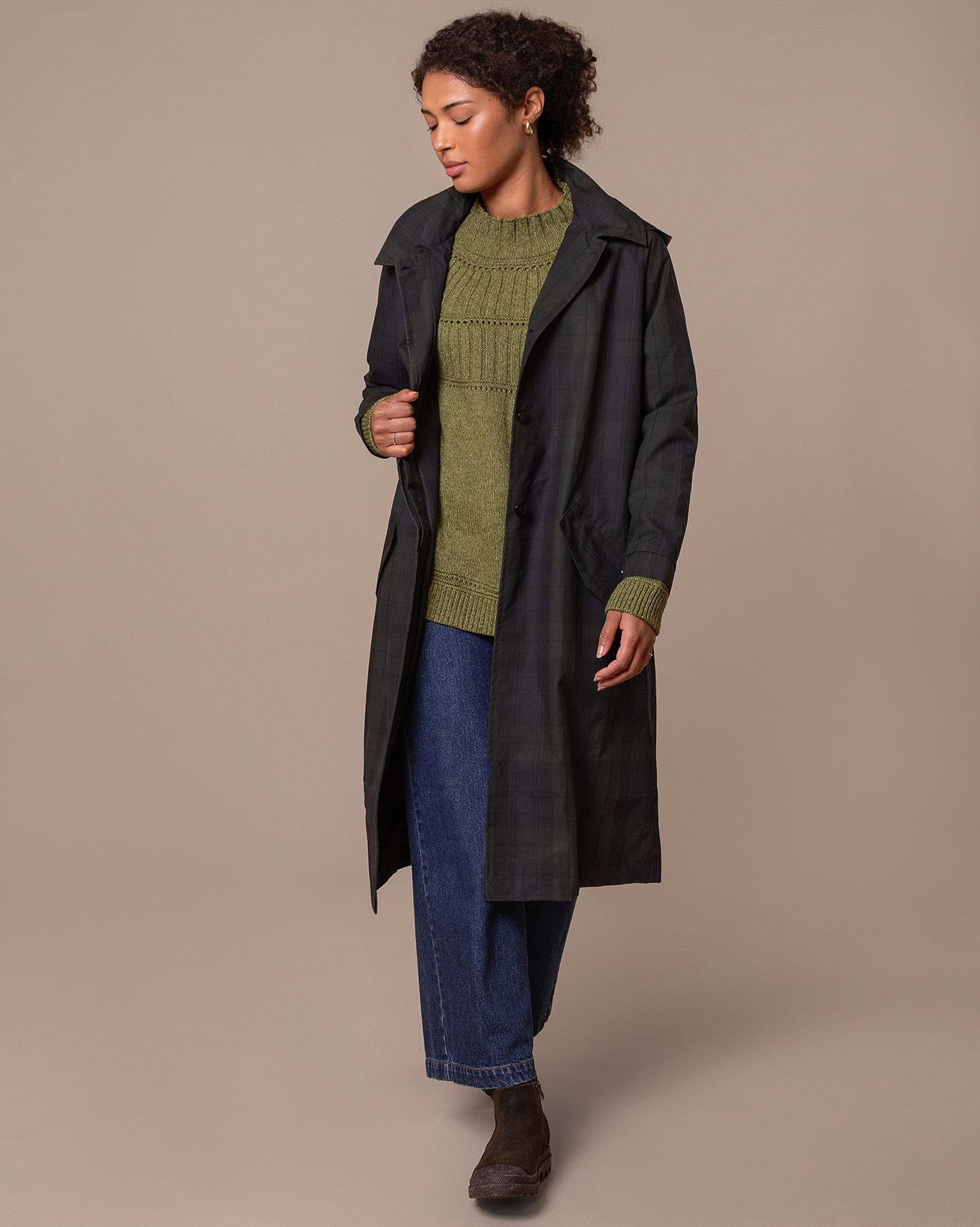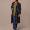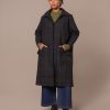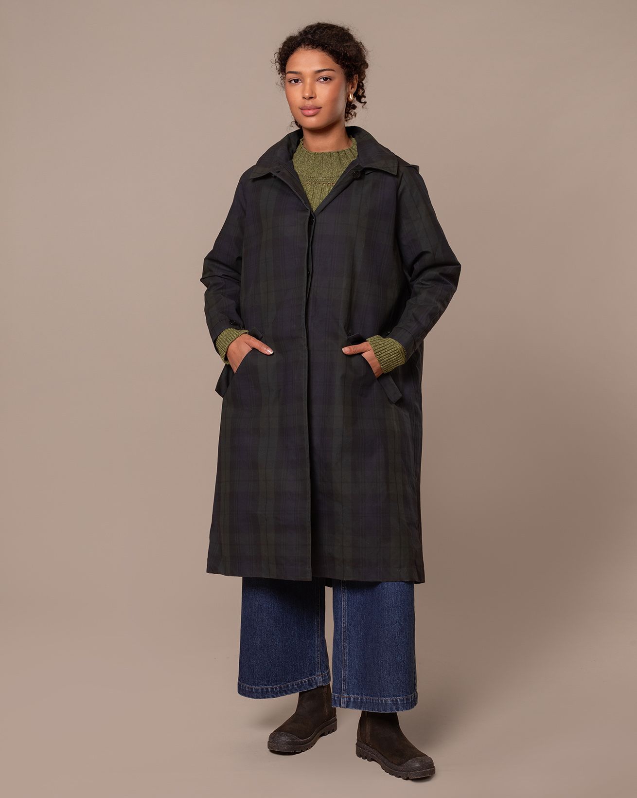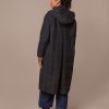 This trench coat, made in Britain, features a collared neckline and an oversized, longline trench shape. It also includes a removable hood for versatile styling.