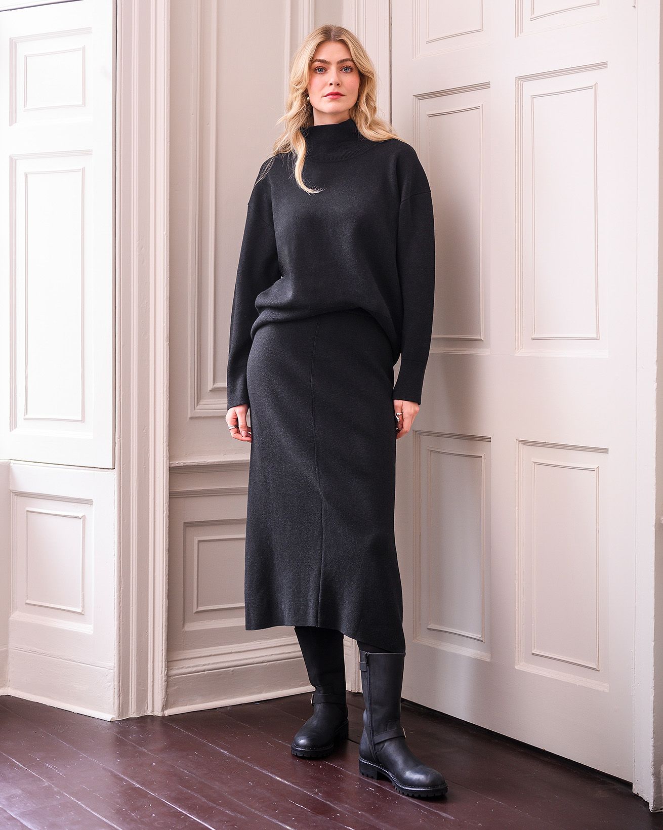 Featuring a dense ponte stitch and cosy funnel neckline, this jumper offers a luxurious weight perfect for cooler days. It pairs perfectly with the co-ord Ponte Knit Midi Skirt for an effortless day-to-evening ensemble.