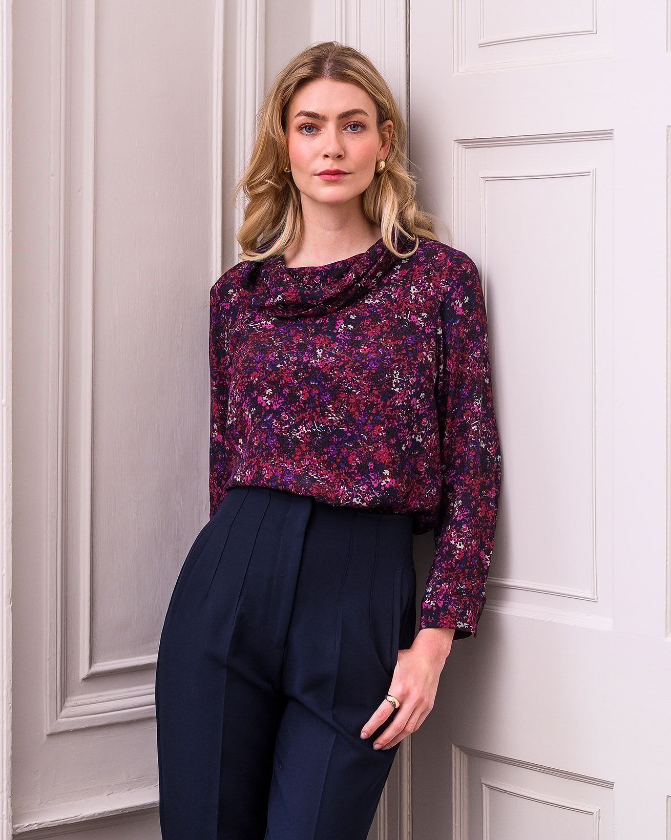 This beautiful woven blouse has a high, modest cowl neckline made with a double layer of fabric. Perfect for warmth in the cooler months, the long sleeves are finished with pretty shirt cuffs that fasten with natural Corozo buttons. We’ve added splits in the side seam for ease of fit.