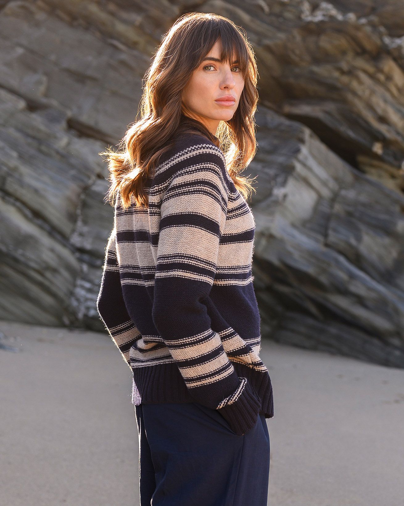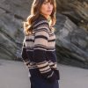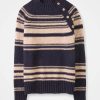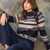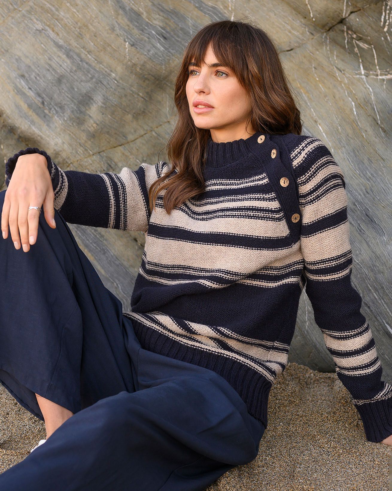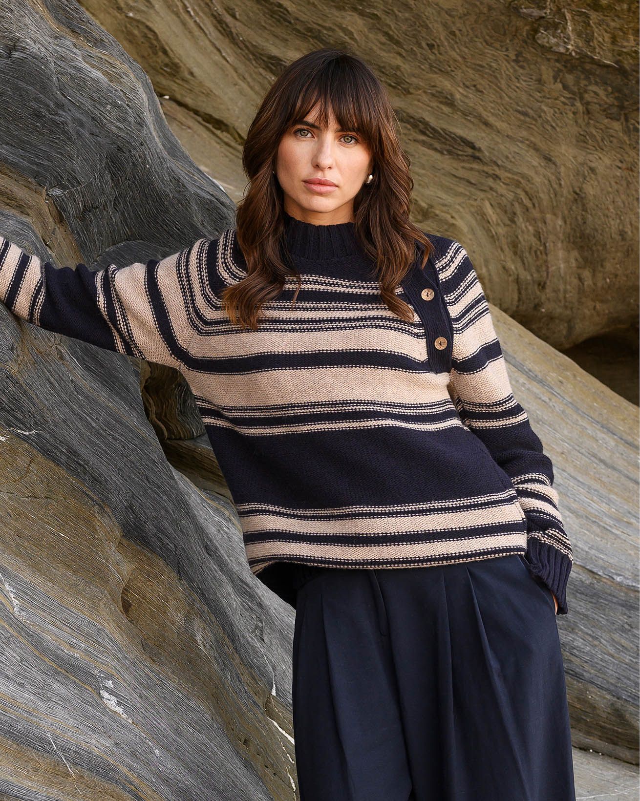 This funnel neckline jumper features button detailing and raglan sleeves for a relaxed fit. The variegated stripe reverse stitch pattern adds visual interest, creating a unique piece that balances warmth and character for everyday wear.