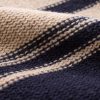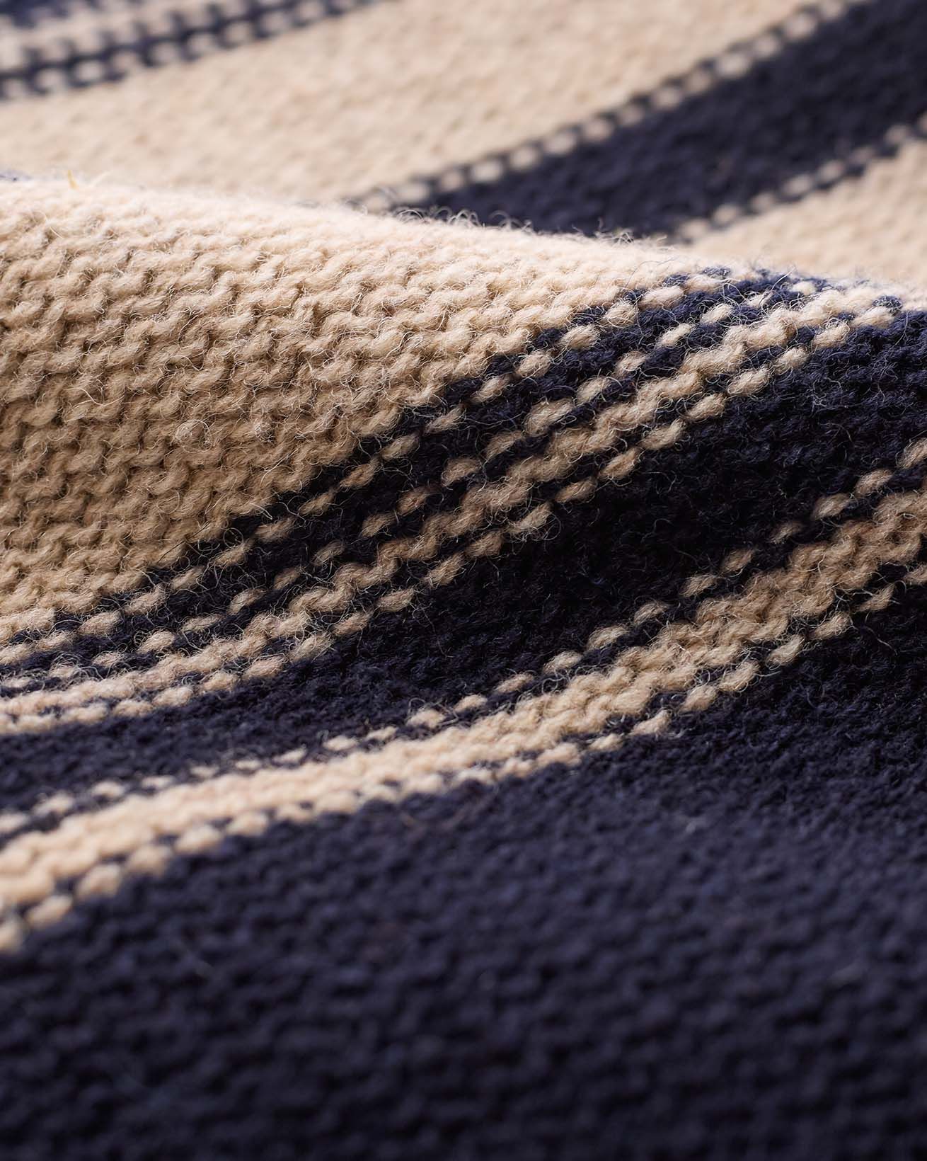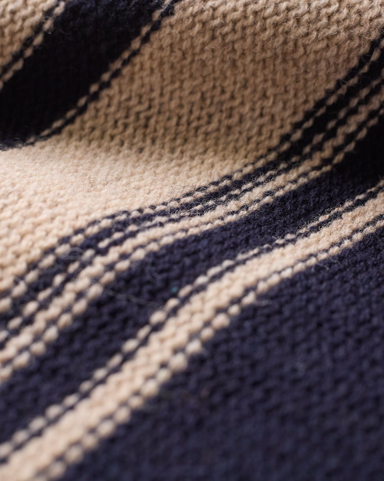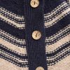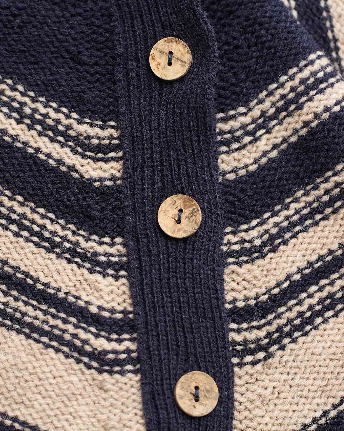 This funnel neckline jumper features button detailing and raglan sleeves for a relaxed fit. The variegated stripe reverse stitch pattern adds visual interest, creating a unique piece that balances warmth and character for everyday wear.