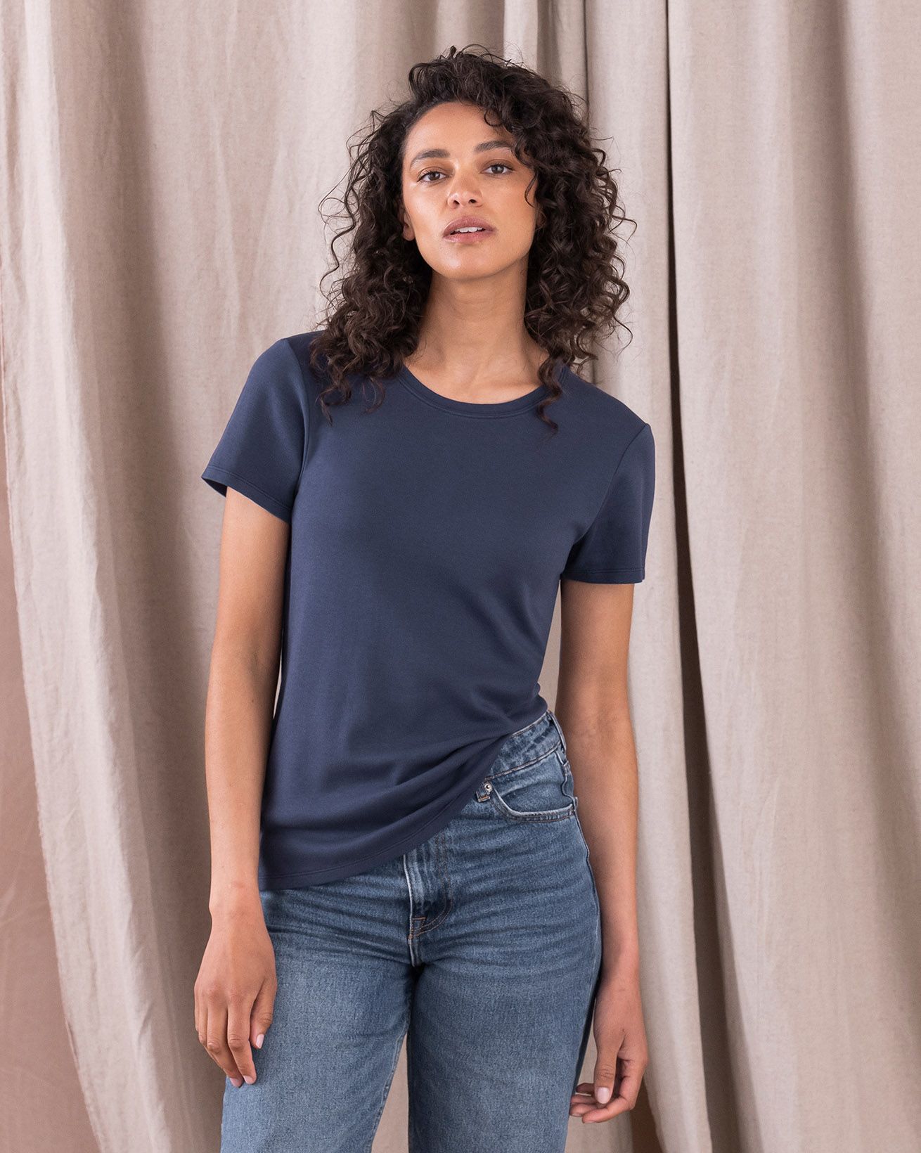 Slim fitting and short sleeved, this is a classic T-shirt shape with a crew neck made in our high quality interlock organic cotton jersey. Incredibly soft on skin, this breathable layer is great for wearing alone or under your favourite jumper. Designed to be a beautiful basic, wear it everyday, all year round.