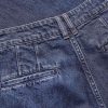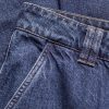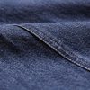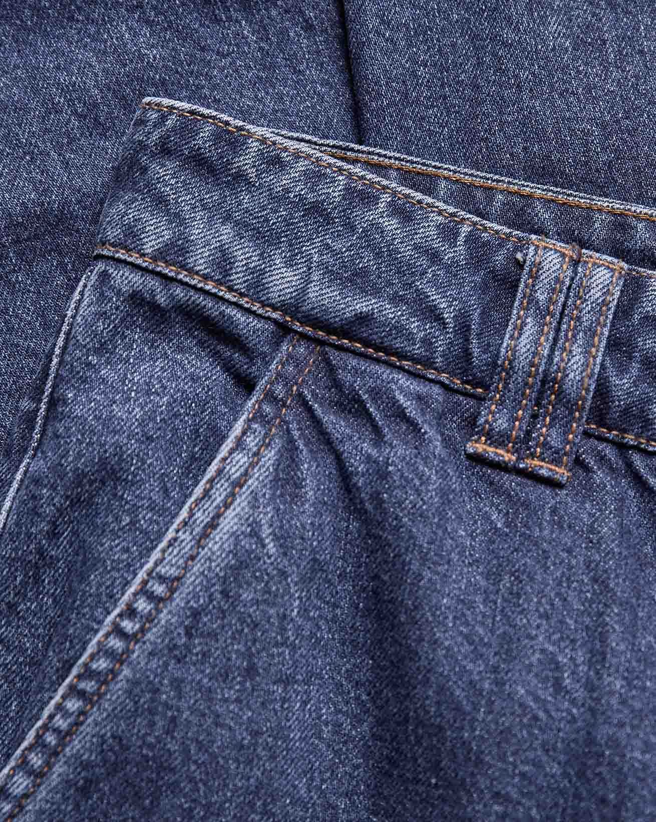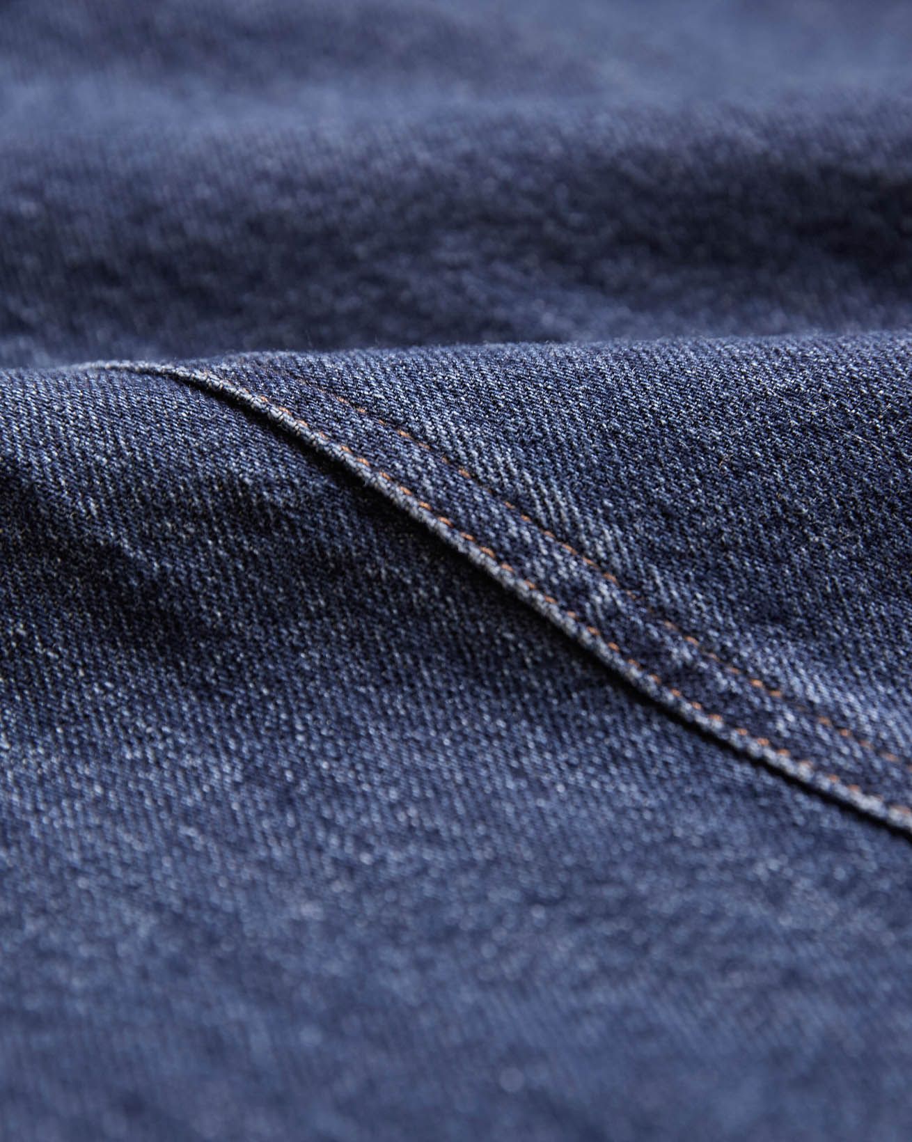 Indigo denim in a classic, non-stretch weave. The garment has been washed to reveal varied shades of blue, adding depth and character to the fabric.